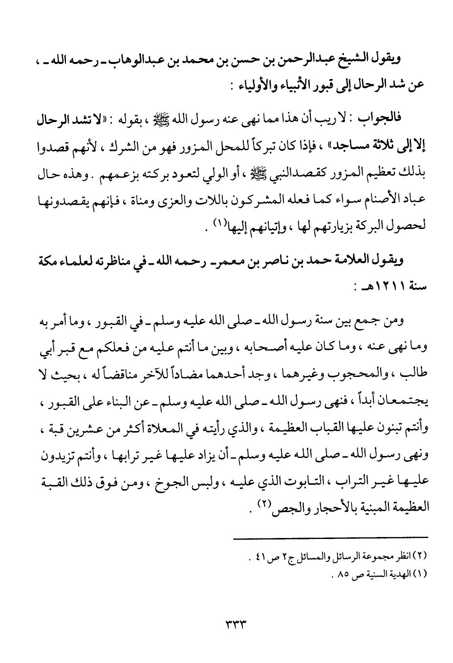 ويقول الشيخ عبد الرحمن بن حسن بن محمد بن عبد الوهاب رحمه الله عن شد الرحال إلى قبور الأنبياء والأولياء: