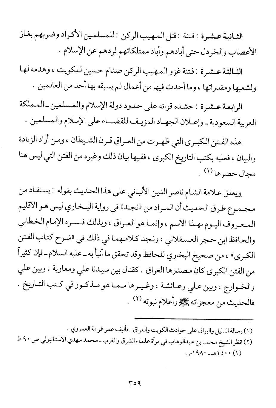 الثالثة عشرة: فتنة غزو المهيب الركن صدام حسين للكويت، وهدمه لها ولشعبها ومقدراتها، وما أحدث فيها من أعمال لم يسبقه بها أحد من العالمين.