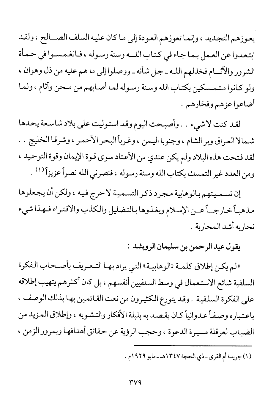 "لم يكن إطلاق كلمة "الوهابية" التي يراد بها التعريف بأصحاب الفكرة السلفية شائع الاستعمال في وسط السلفيين أنفسهم، بل كان أكثرهم يتهيب إطلاقه على الفكرة السلفية. وقد يتورع الكثيرون من نعت القائمين بها بذلك الوصف، باعتباره وصفاً عدوانياً كان يقصد به بلبلة الأفكار والتشويه، وإطلاق المزيد من الضباب لعرقلة مسيرة الدعوة، وحجب الرؤية عن حقائق أهدافها وبمرور الزمن،