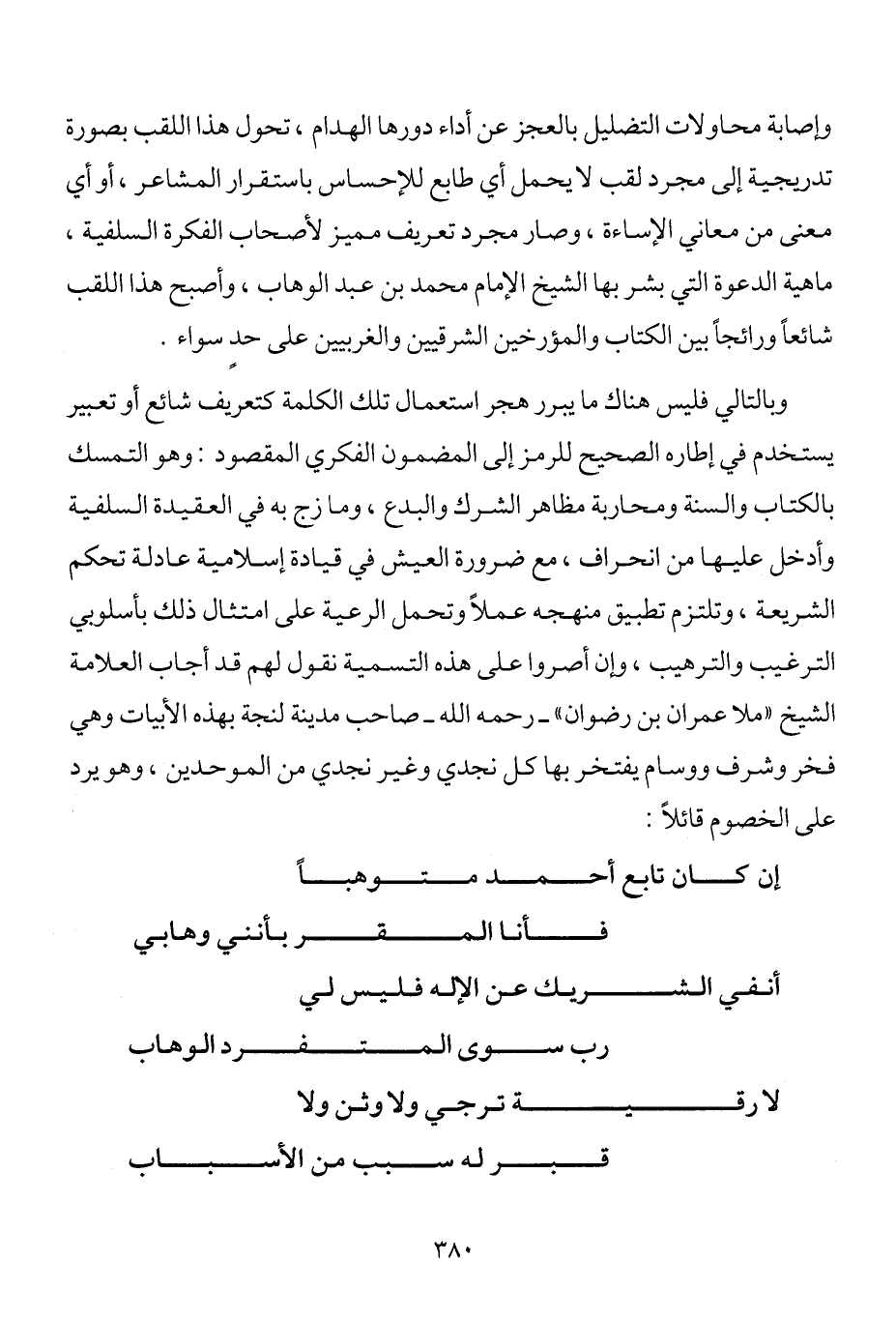 وبالتالي فليس هناك ما يبرر هجر استعمال تلك الكلمة كتعريف شائع أو تعبير يستخدم في إطاره الصحيح للرمز إلى المضمون الفكري المقصود: وهو التمسك بالكتاب والسنة ومحاربة مظاهر الشرك والبدع، وما زج به في العقيدة السلفية وأدخل عليها من انحراف، مع ضرورة العيش في قيادة إسلامية عادلة تحكم الشريعة، وتلتزم تطبيق منهجه عملاً وتحمل الرعية على امتثال ذلك بأسلوبي الترغيب والترهيب، وإن أصروا على هذه التسمية نقول لهم قد أجاب العلامة الشيخ "ملا عمران بن رضوان" رحمه الله صاحب مدينة لنجة بهذه الأبيات وهي فخر وشرف ووسام يفتخر بها كل نجدي وغير نجدي من الموحدين، وهو يرد على الخصوم قائلاً: