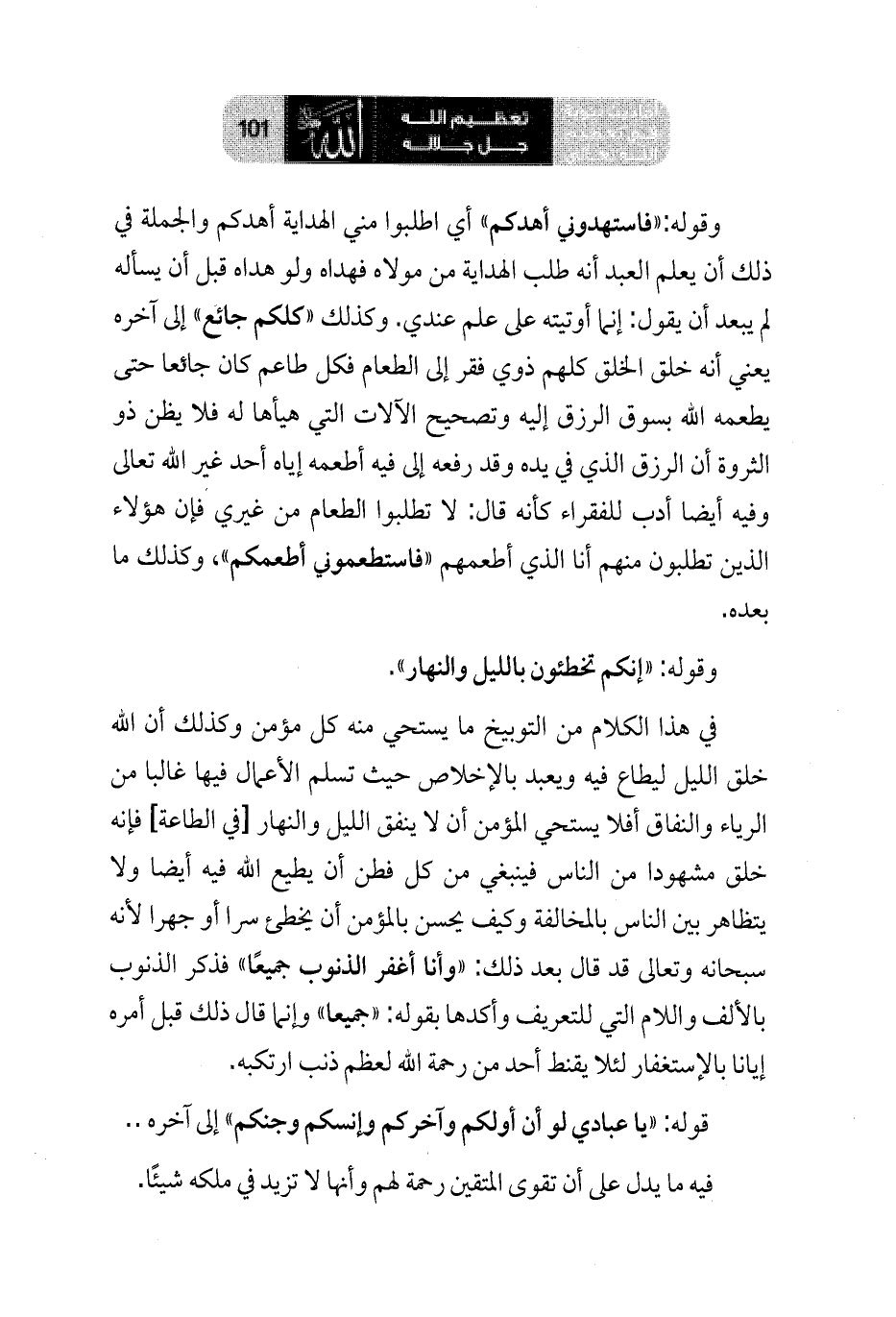 في هذا الكلام من التوبيخ ما يستحي منه كل مؤمن وكذلك أن الله خلق الليل ليطاع فيه ويعبد بالإخلاص حيث تسلم الأعمال فيها غالبا من الرياء والنفاق أفلا يستحي المؤمن أن لا ينفق الليل والنهار [في الطاعة] فإنه خلق مشهودا من الناس فينبغي من كل فطن أن يطيع الله فيه أيضا ولا يتظاهر بين الناس بالمخالفة وكيف يحسن بالمؤمن أن يخطئ سرا أو جهرا لأنه سبحانه وتعالى قد قال بعد ذلك: «وأنا أغفر الذنوب جميعًا» فذكر الذنوب بالألف واللام التي للتعريف وأكدها بقوله: «جميعا» وإنما قال ذلك قبل أمره إيانا بالإستغفار لئلا يقنط أحد من رحمة الله لعظم ذنب ارتكبه.