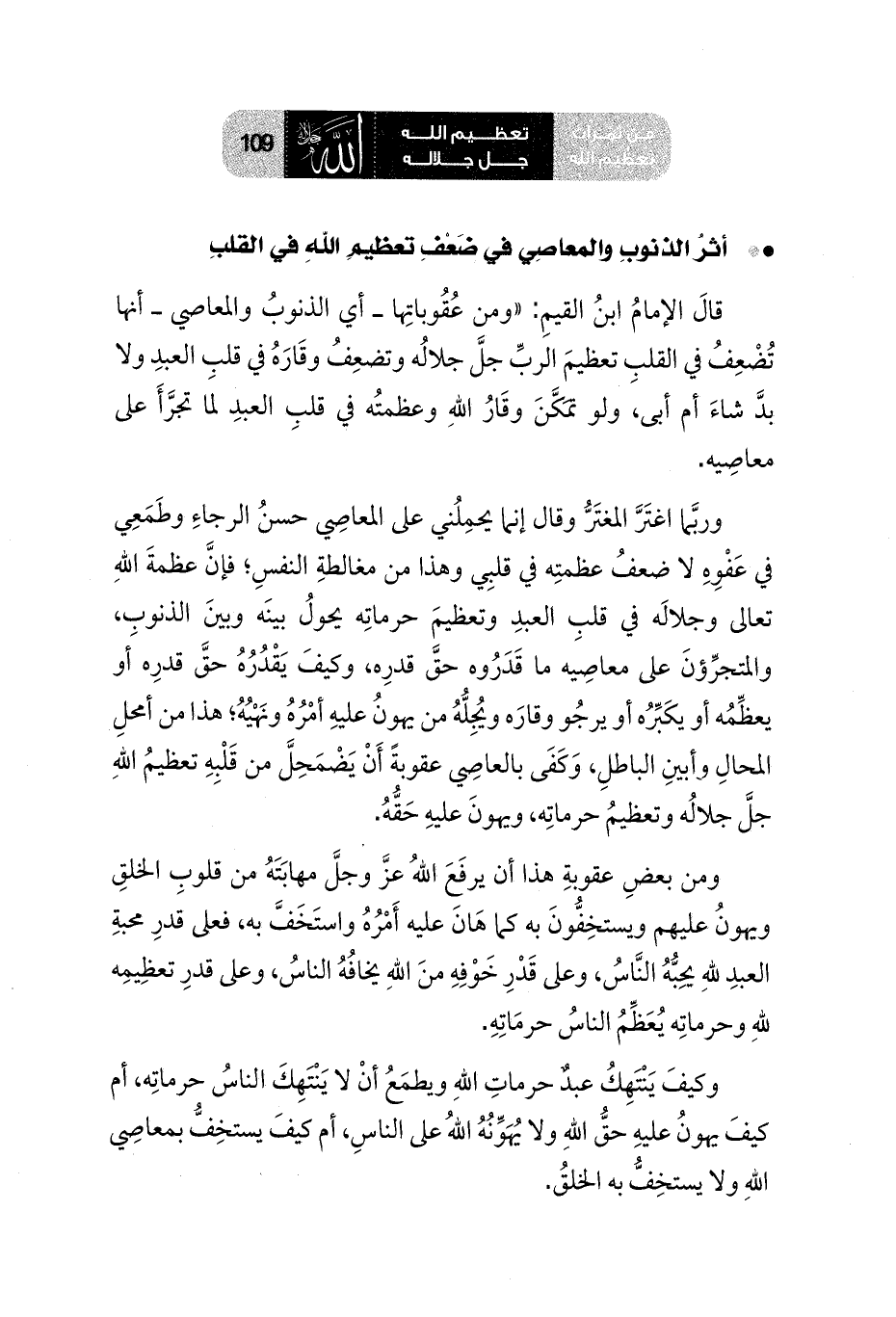 وربَّما اغتَرَّ المغتَرُّ وقال إنما يحمِلُني على المعاصِي حسنُ الرجاءِ وطَمَعِي في عَفْوِهِ لا ضعفُ عظمتِه في قلبِي وهذا من مغالطةِ النفسِ؛ فإنَّ عظمةَ اللهِ تعالى وجلالَه في قلبِ العبدِ وتعظيمَ حرماتِه يحولُ بينَه وبينَ الذنوبِ، والمتجرِّؤنَ على معاصِيه ما قَدَرُوه حقَّ قدرِه، وكيفَ يَقْدُرُهُ حقَّ قدرِه أو يعظِّمُه أو يكَبِّرُه أو يرجُو وقارَه ويُجِلُّهُ من يهونُ عليهِ أمْرُهُ ونَهْيُهُ؛ هذا من أمحلِ المحالِ وأبينِ الباطلِ، وَكَفَى بالعاصِي عقوبةً أَنْ يَضْمَحِلَّ من قَلْبِهِ تعظيمُ اللهِ جلَّ جلالُه وتعظيمُ حرماتِه، ويهونَ عليهِ حَقُّهُ.