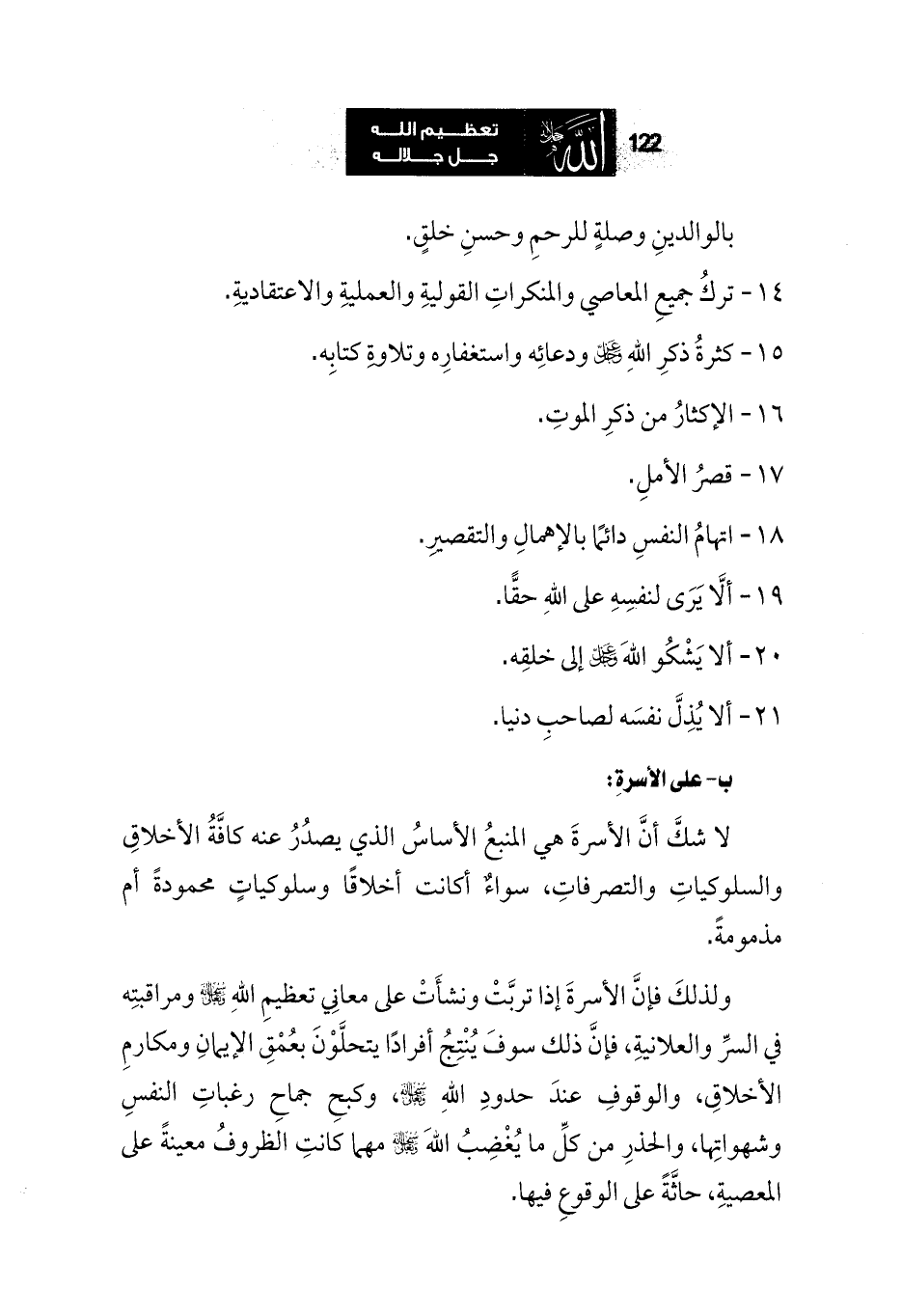 ولذلكَ فإنَّ الأسرةَ إذا تربَّتْ ونشأَتْ على معانِي تعظيمِ اللهِ ـ ومراقبتِه في السرِّ والعلانيةِ، فإنَّ ذلك سوفَ يُنْتِجُ أفرادًا يتحلَّوْنَ بعُمْقِ الإيمانِ ومكارمِ الأخلاقِ، والوقوفِ عندَ حدودِ اللهِ ـ، وكبحِ جماحِ رغباتِ النفسِ وشهواتِها، والحذرِ من كلِّ ما يُغْضِبُ اللهَ ـ مهما كانتِ الظروفُ معينةً على المعصيةِ حاثَّةً على الوقوعِ فيها.