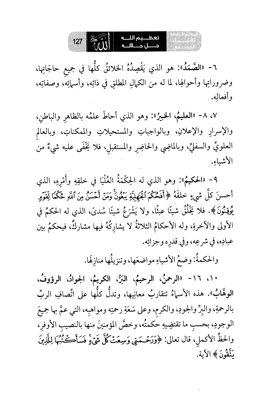 6 - «الصَّمَدُ»: هو الذي يَقْصِدُهُ الخلائقُ كلُّها في جميعِ حاجَاتِها، وضروراتِها وأحوالِها، لما له من الكمالِ المطلقِ في ذاتِه، وأسمائِه، وصفاتِه، وأفعالِه.