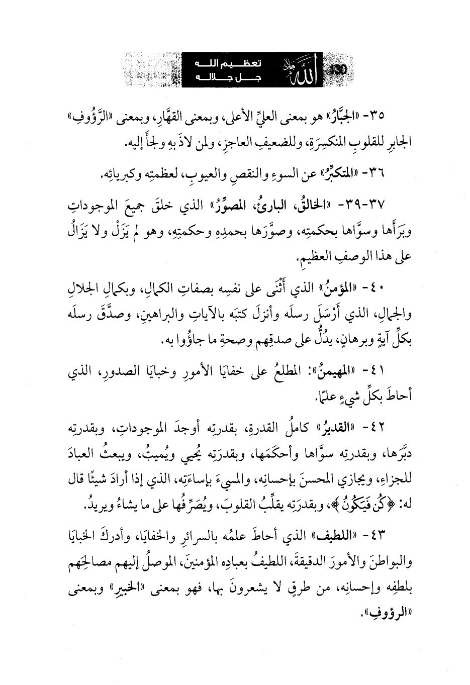 35 - «الجبَّارُ» هو بمعنى العليِّ الأعلى، وبمعنى القهَّارِ، وبمعنى «الرَّؤُوفِ» الجابرِ للقلوبِ المنكسِرَةِ، وللضعيفِ العاجزِ، ولمن لاذَ بهِ ولجأَ إليه.