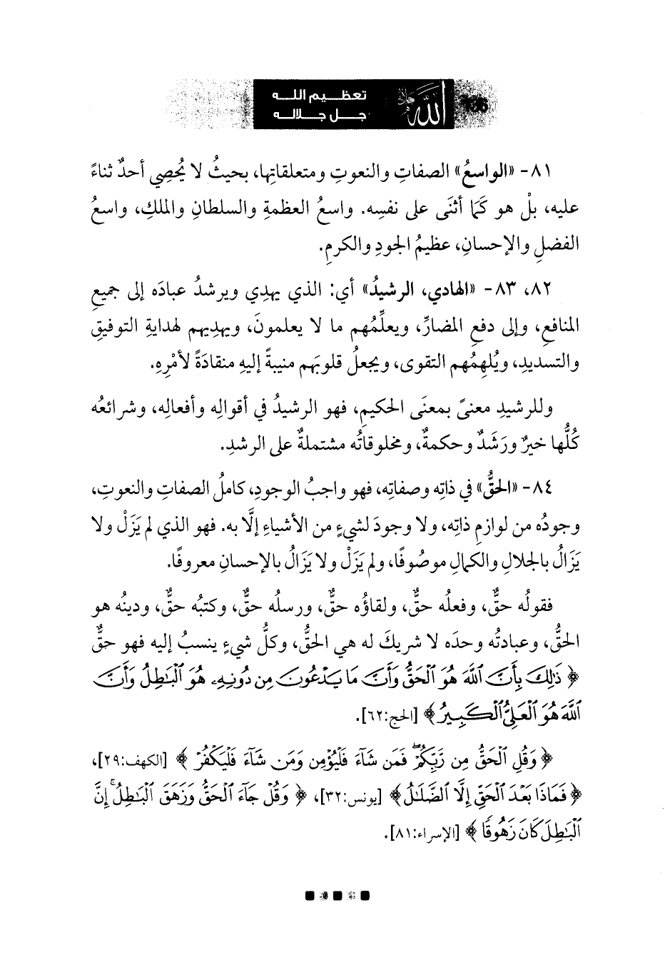 84 - «الحقُّ» في ذاتِه وصفاتِه، فهو واجبُ الوجودِ، كاملُ الصفاتِ والنعوتِ، وجودُه من لوازمِ ذاتِه، ولا وجودَ لشيءٍ من الأشياءِ إلا به. فهو الذي لم يَزَلْ ولا يَزَالُ بالجلالِ والكمالِ موصُوفًا، ولم يَزَلْ ولا يَزَالُ بالإحسانِ معروفًا.