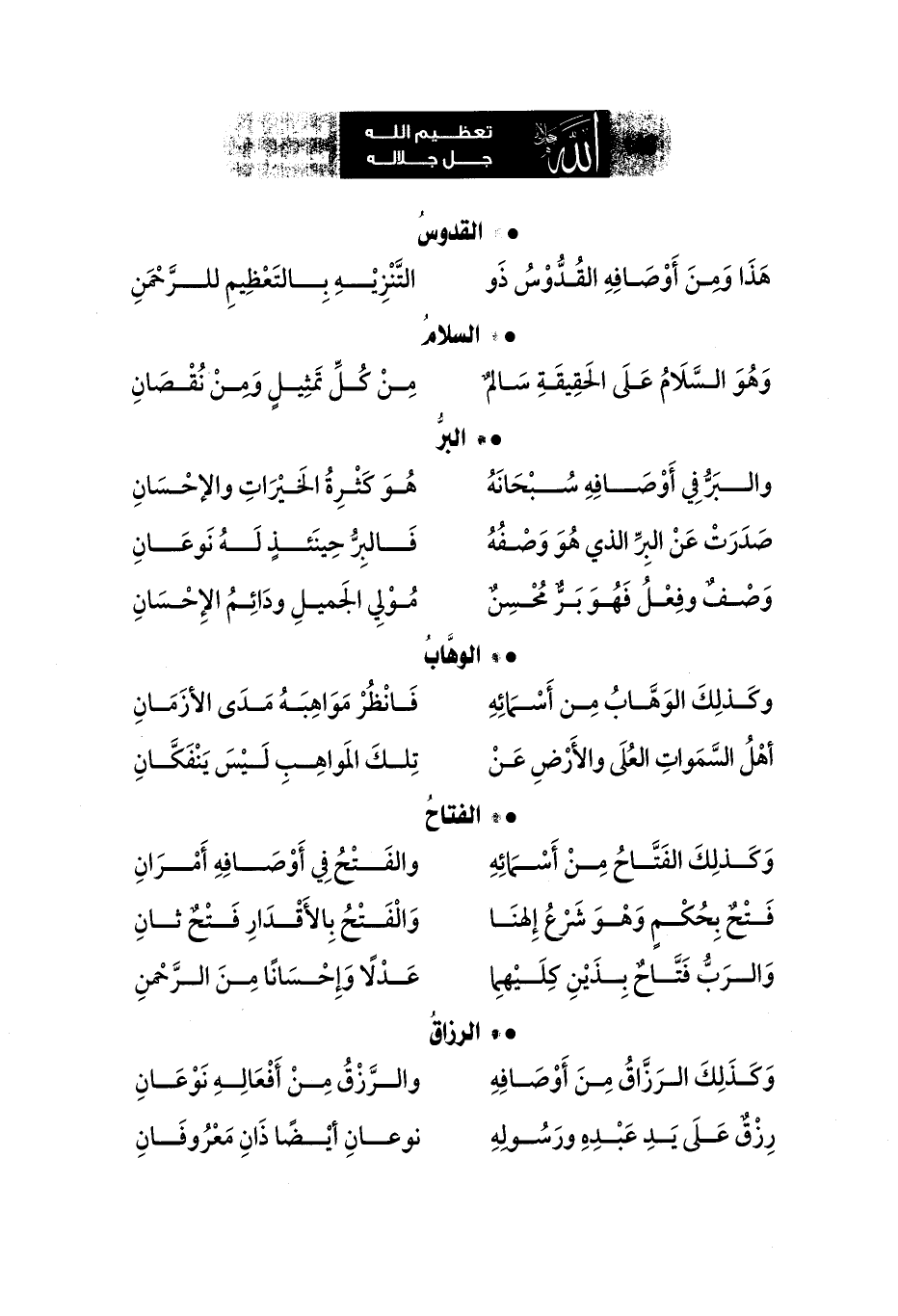 هَذَا وَمِنَ أَوْصَافِهِ القُدُّوْسُ ذَو ... التَّنْزِيْهِ بِالتَعْظِيمِ للرَّحْمَن