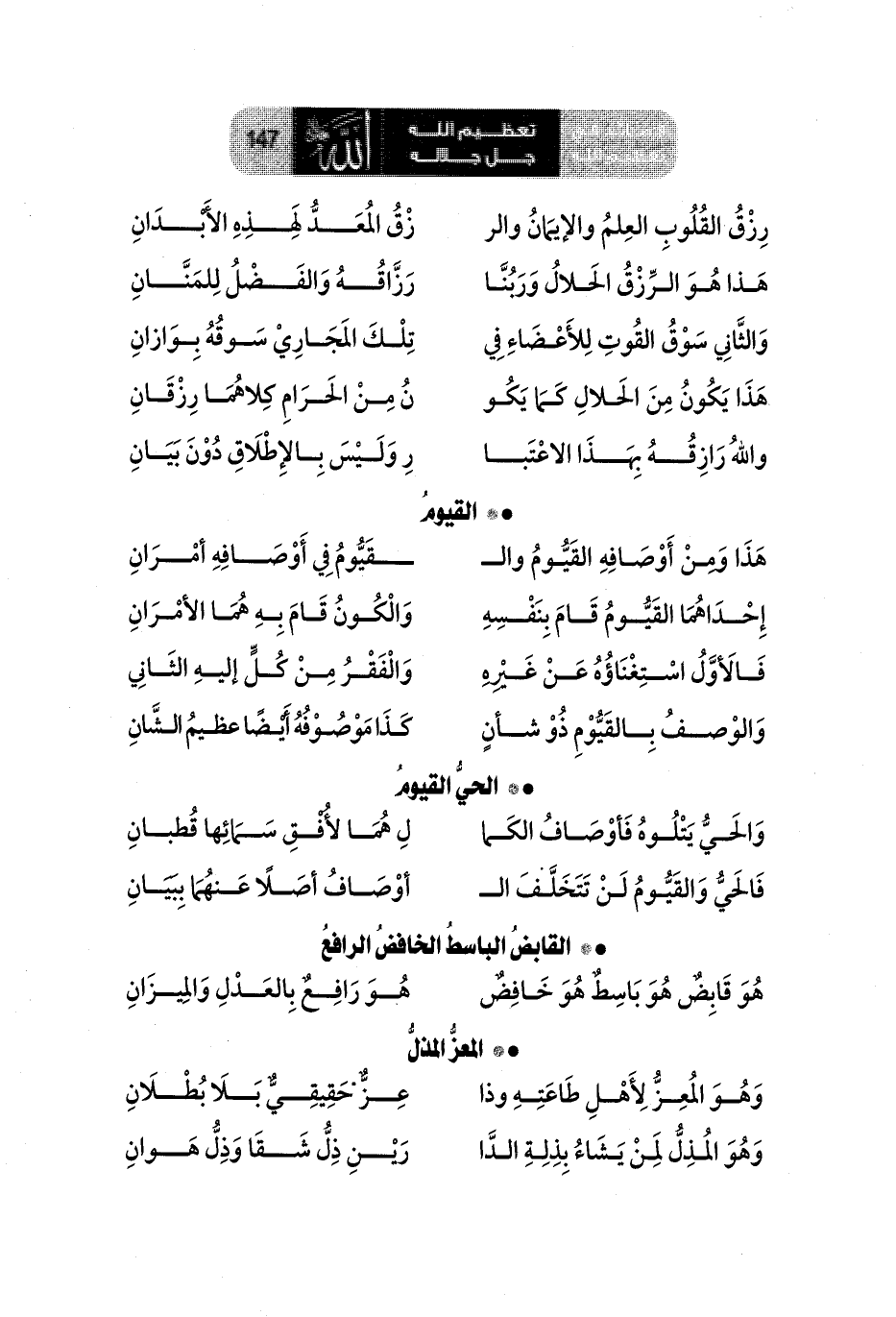 هَذَا وَمِنْ أَوْصَافِهِ القَيُّومُ والـ ... ـقَيُّومُ فِي أَوْصَافِهِ أمْرَان