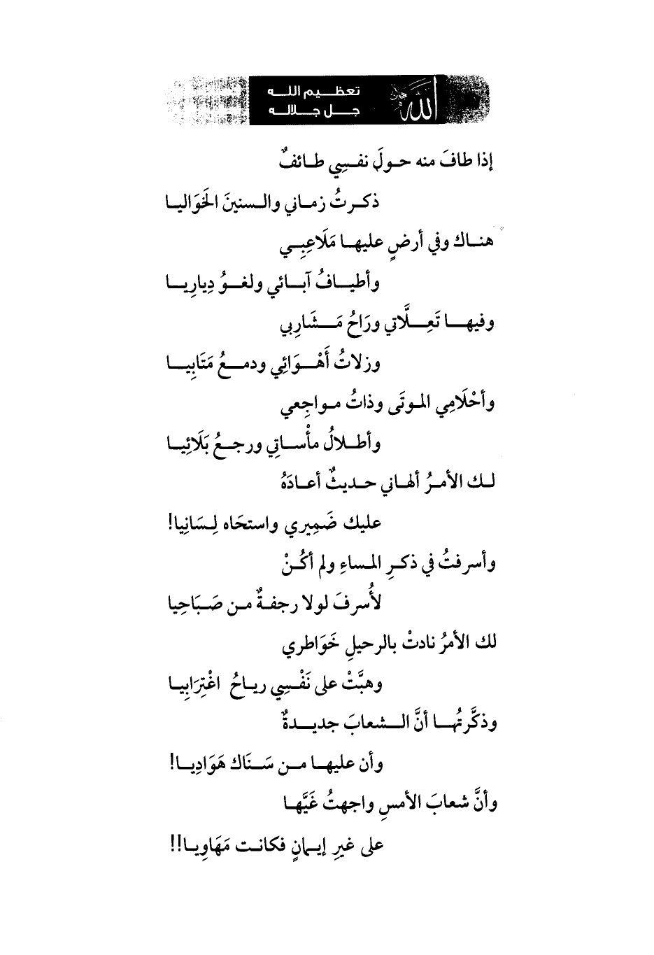 إذا طافَ منه حولَ نفسِي طائفٌ ... ذكرتُ زماني والسنينَ الخَوَاليا
