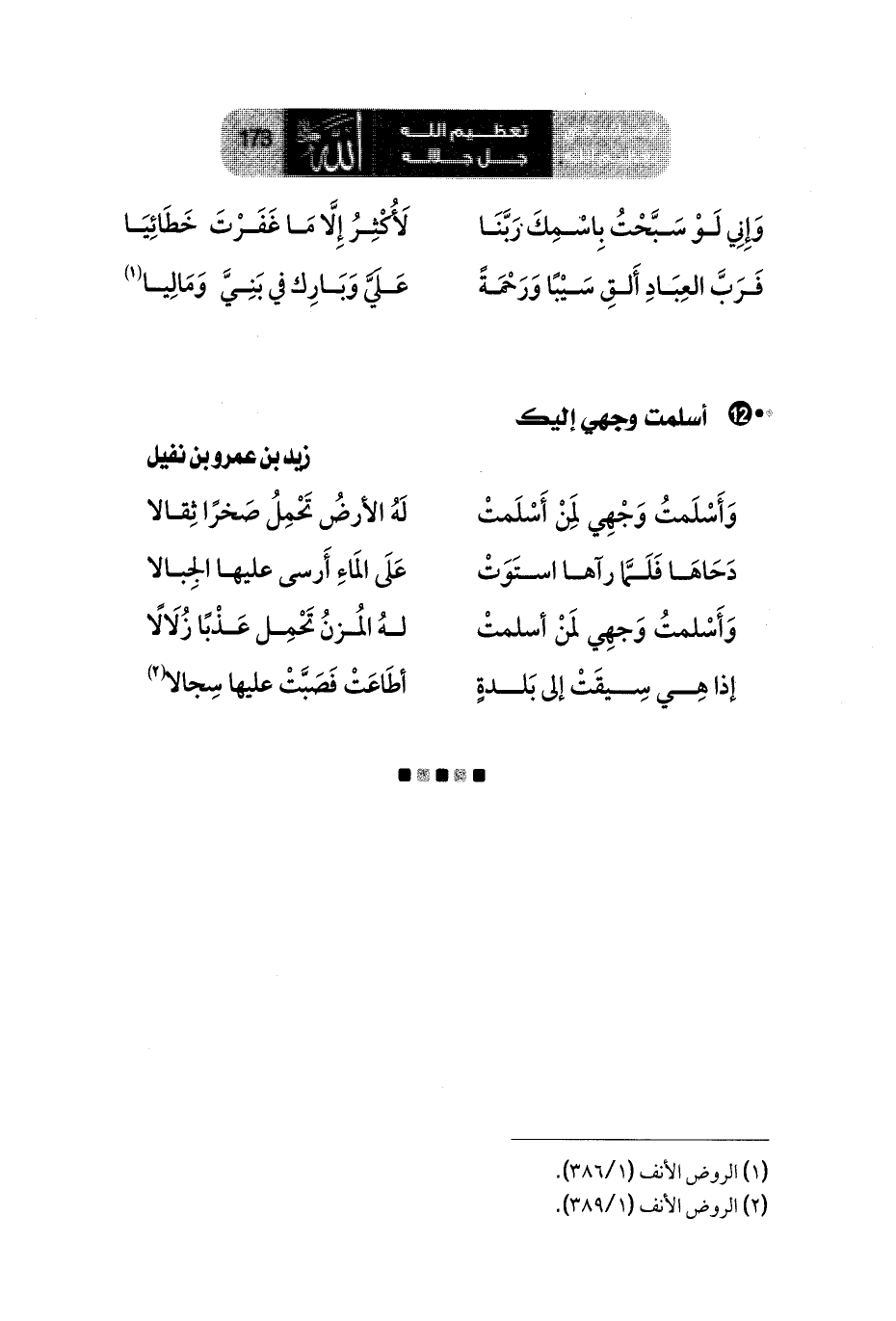 وَأَسْلَمتُ وَجْهِي لِمَنْ أَسْلَمتْ ... لَهُ الأرضُ تَحْمِلُ صَخرًا ثِقالا