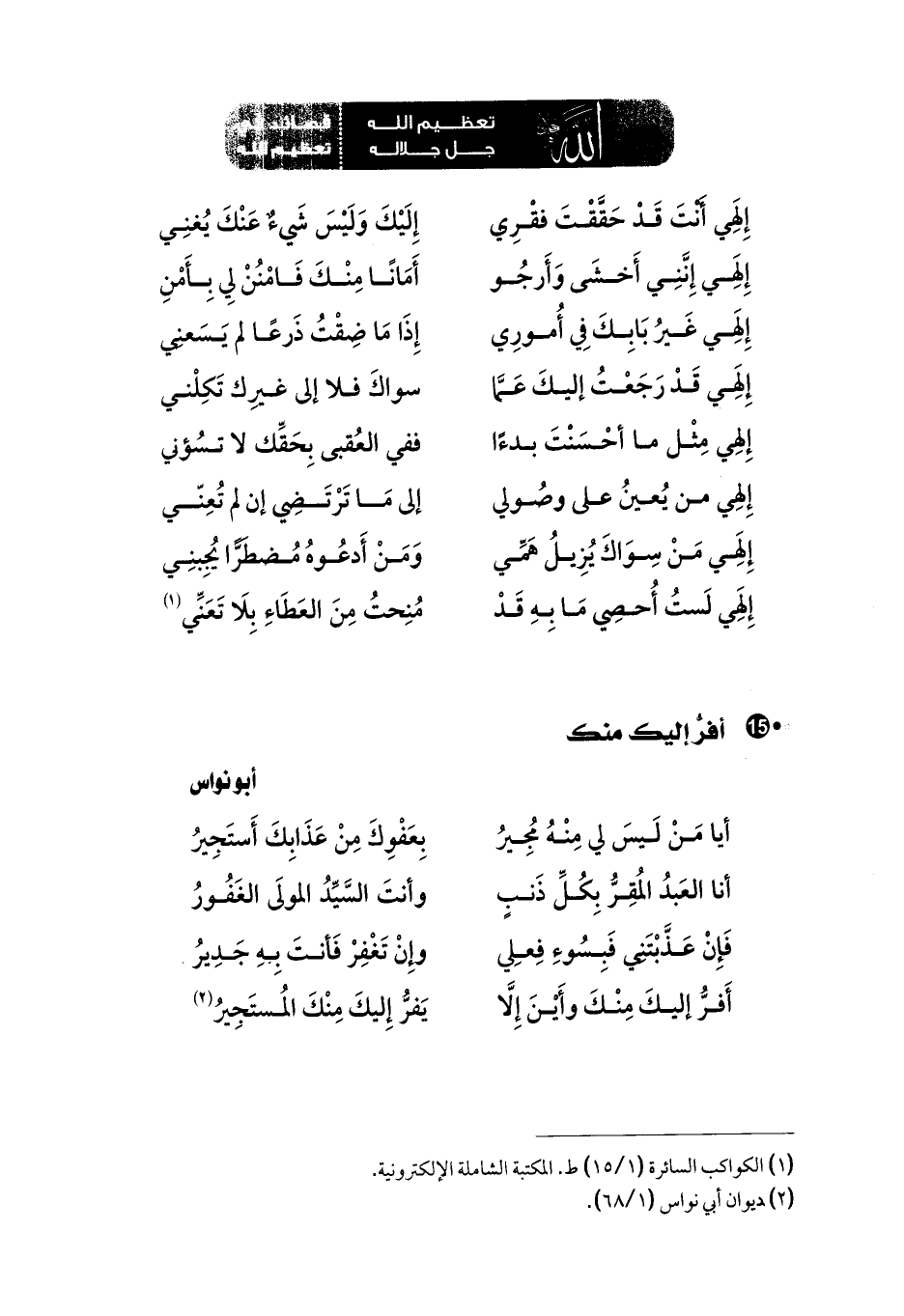 أَفرُّ إليكَ مِنْكَ وأَيْنَ إِلَّا ... يَفرُّ إِليكَ مِنْكَ المُستَجِيرُ (¬2)