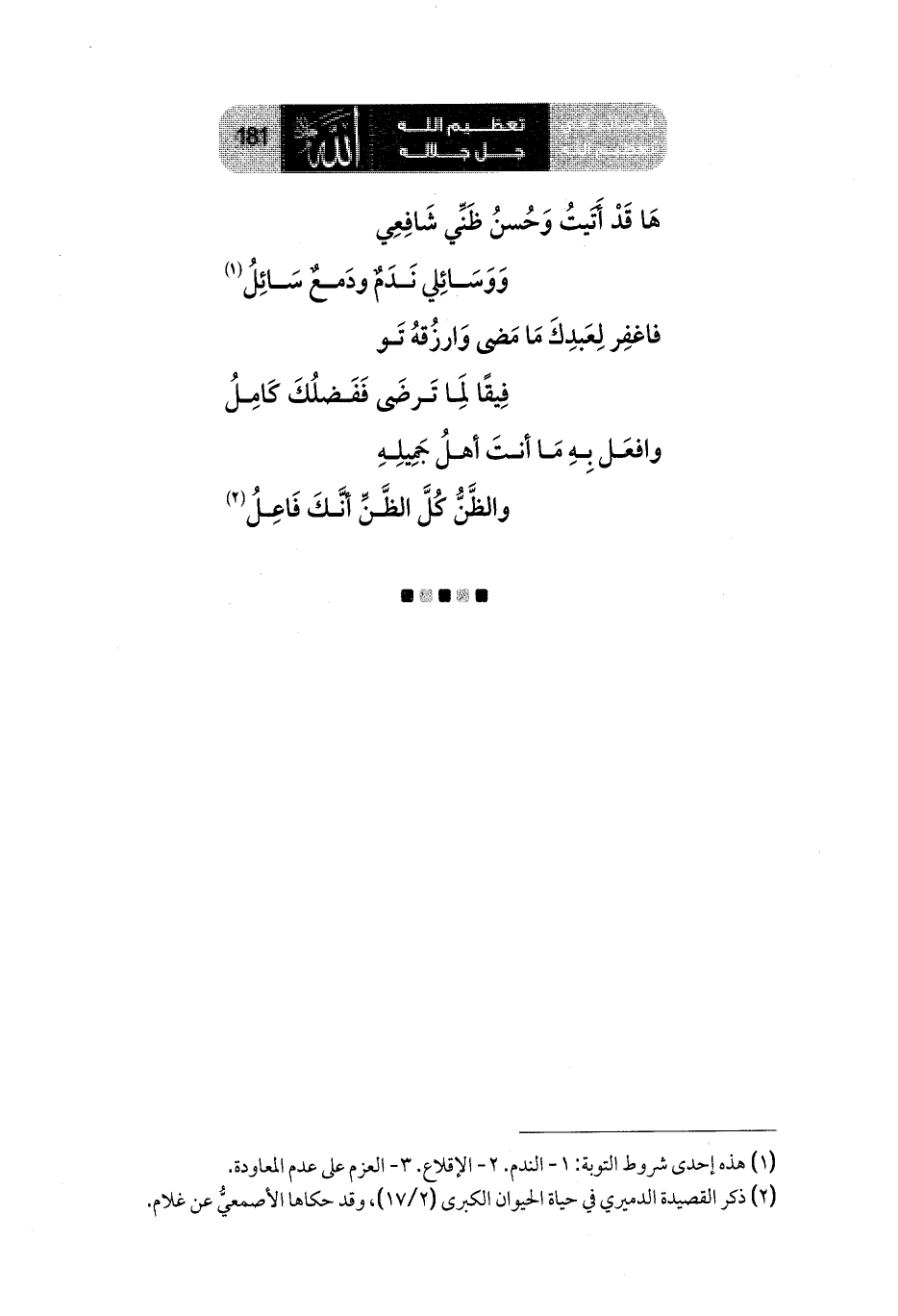 هَا قَدْ أَتَيتُ وَحُسنُ ظَنِّي شَافِعِي ... وَوَسَائِلي نَدَمٌ ودَمعٌ سَائِلُ (¬1)