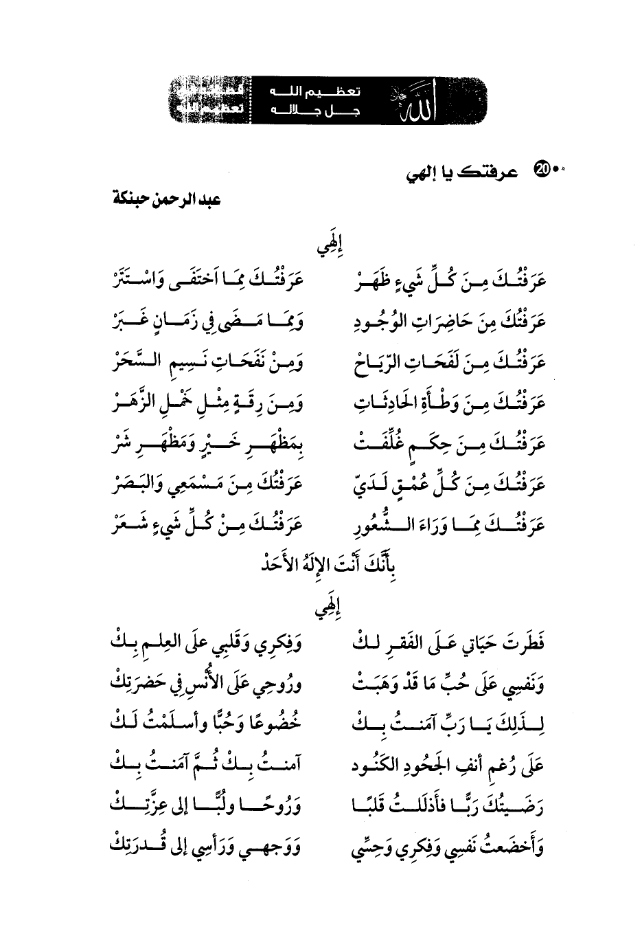 عَرَفْتُكَ مِنَ كُلِّ شَيءٍ ظَهَرْ ... عَرَفْتُكَ مِمَا اَختَفَى وَاسْتَتَرْ