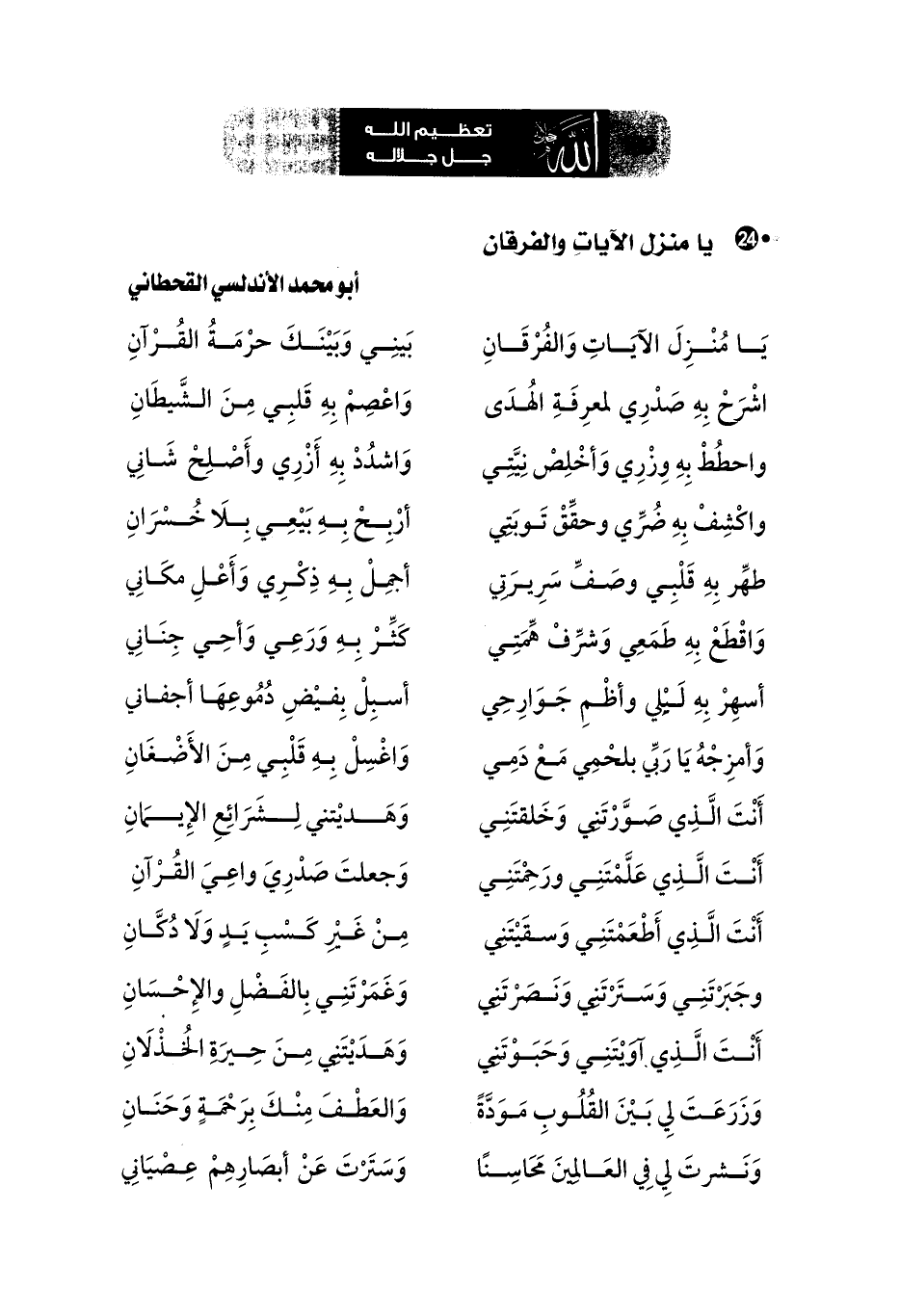 يَا مُنْزِلَ الآيَاتِ وَالفُرْقَانِ ... بَينِي وَبَيْنَكَ حرْمَةُ القُرْآن