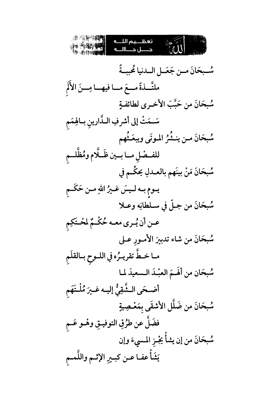 سُبحَانَ من شاء تدبيرَ الأمورِ على ... ما خطَّ تقريرُه في اللوحِ بالقلَم