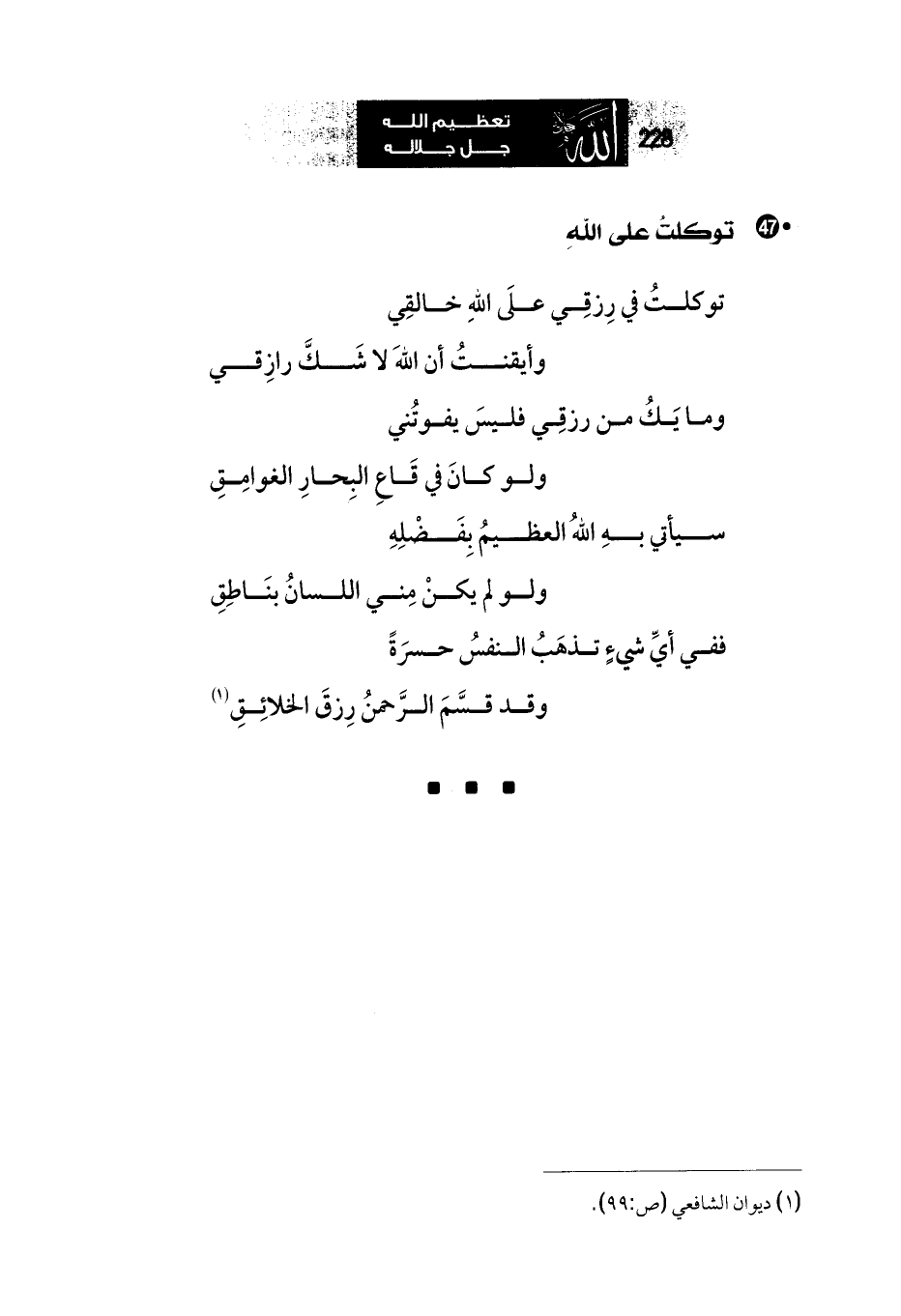 توكلتُ في رِزقِي علَى اللهِ خالقِي ... وأيقنتُ أن اللهَ لا شَكَّ رازِقي