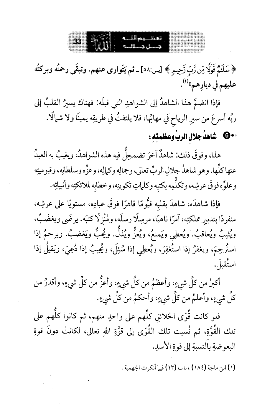 هذا، وفوقَ ذلك: شاهدٌ آخرَ تضمحِلُّ فيه هذه الشواهدُ، ويغيبُ به العبدُ عنها كلِّها. وهو شاهدُ جلالِ الربِّ تعالى، وجمالِه وكمالِه، وعزِّه وسلطانِه، وقيوميتِه وعلوِّه فوقَ عرشِه، وتكلُّمِه بكتبِه وكلماتِ تكوينِه، وخطابِه لملائكتِه وأنبيائِه.