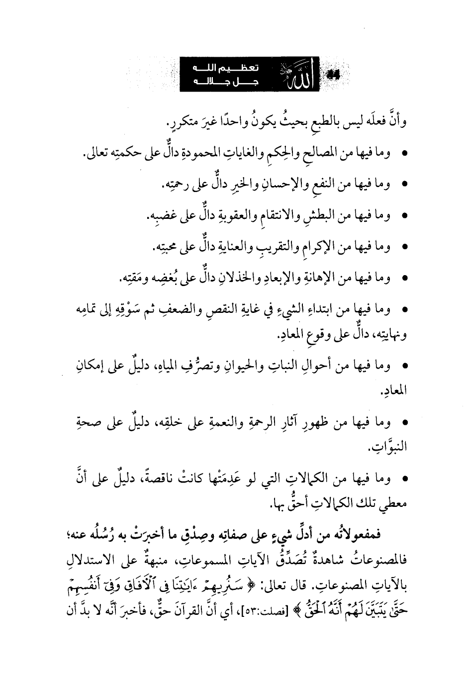 فمفعولاتُه من أدلِّ شيءٍ على صفاتِه وصِدْقِ ما أخبرَتْ به رُسُلُه عنه؛ فالمصنوعاتُ شاهدةٌ تُصَدِّقُ الآياتِ المسموعاتِ، منبهةٌ على الاستدلالِ بالآياتِ المصنوعاتِ. قال تعالى: {سَنُرِيهِمْ آيَاتِنَا فِي الْآفَاقِ وَفِي أَنفُسِهِمْ حَتَّى يَتَبَيَّنَ لَهُمْ أَنَّهُ الْحَقُّ} [فصلت:53]، أي أنَّ القرآنَ حقٌّ، فأخبرَ أنَّه لا بدَّ أن