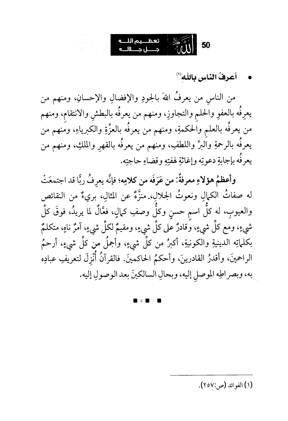 وأعظمُ هؤلاءِ معرفةً: من عَرَفَه من كلامِه؛ فإنَّه يعرِفُ ربًّا قد اجتمعَتْ له صفاتُ الكمالِ ونعوتُ الجلالِ، منزَّهٌ عن المثالِ، بريءٌ من النقائص والعيوبِ، له كلُّ اسمٍ حسنٍ وكلُّ وصفِ كمالٍ، فعَّالٌ لما يريدُ، فوقَ كلِّ شيءٍ، ومع كلِّ شيءٍ، وقادرٌ على كلِّ شيءٍ، ومقيمٌ لكلِّ شيءٍ، آمرٌ ناهٍ، متكلمٌ بكلماتِه الدينيةِ والكونيةِ، أكبرُ من كلِّ شيءٍ، وأجملُ من كلِّ شيءٍ، أرحمُ الراحمينَ، وأقدرُ القادرينَ، وأحكمُ الحاكمينَ. فالقرآنُ أُنْزِلَ لتعريفِ عبادِه به، وبصراطِه الموصلِ إليه، وبحالِ السالكينَ بعد الوصولِ إليه.