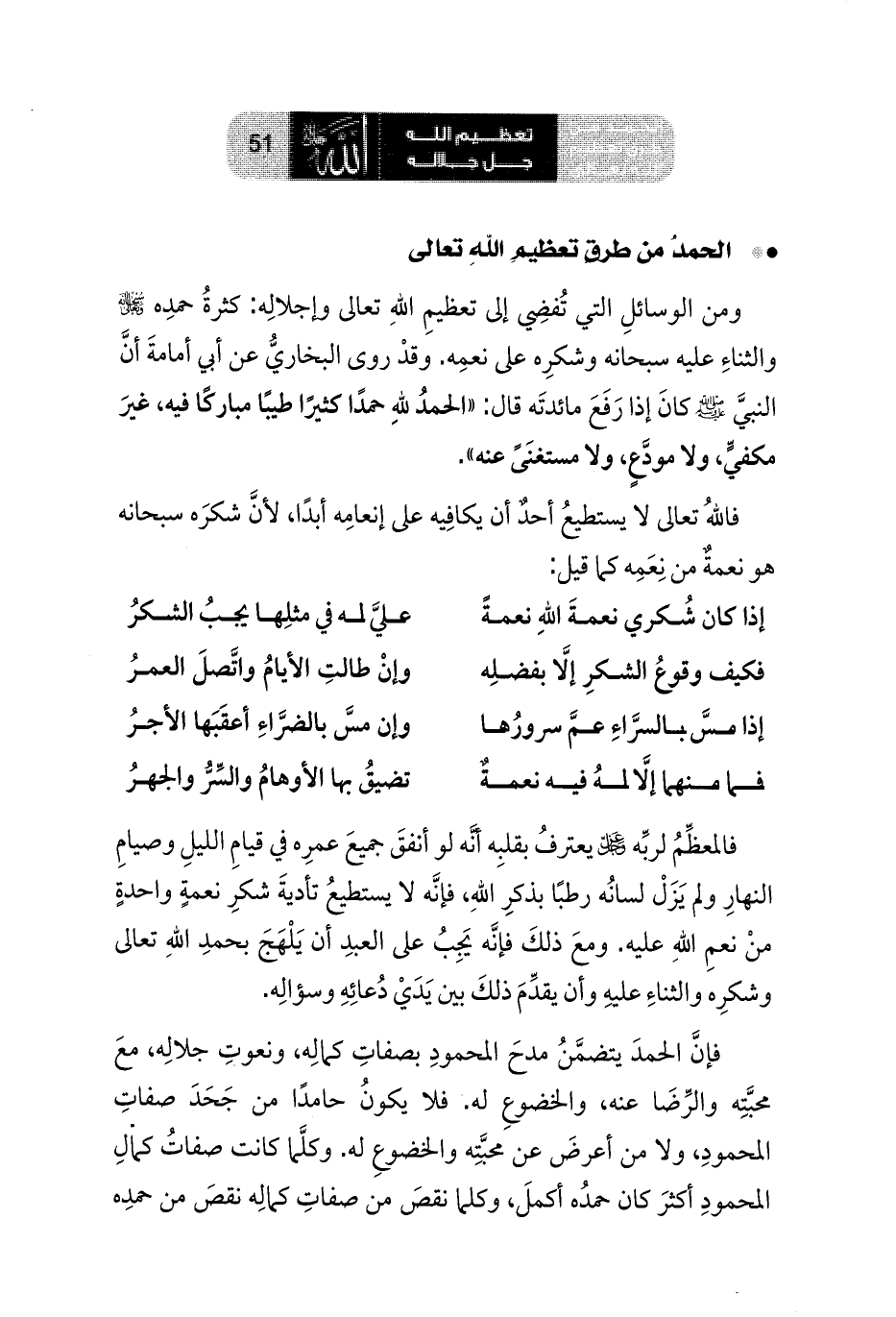 فالمعظِّمُ لربِّه عز وجل يعترفُ بقلبِه أنَّه لو أنفقَ جميعَ عمرِه في قيامِ الليلِ وصيامِ النهارِ ولم يَزَلْ لسانُه رطبًا بذكرِ اللهِ، فإنَّه لا يستطيعُ تأديةَ شكرِ نعمةٍ واحدةٍ منْ نعمِ اللهِ عليه. ومعَ ذلكَ فإنَّه يَجِبُ على العبدِ أن يَلْهَجَ بحمدِ اللهِ تعالى وشكرِه والثناءِ عليهِ وأن يقدِّمَ ذلكَ بين يَدَيْ دُعائِهِ وسؤالِه.