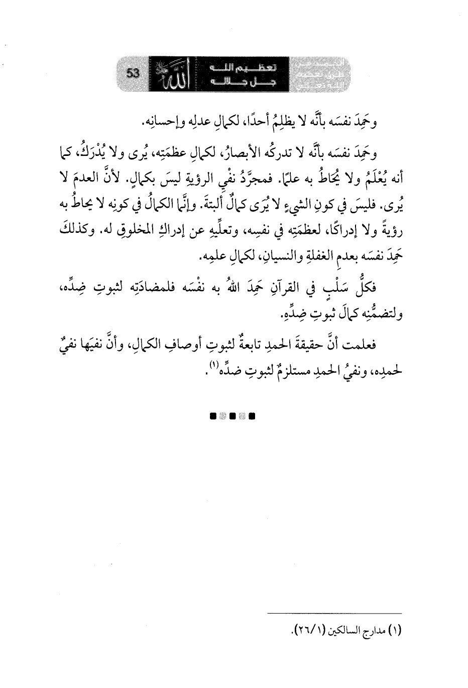 فعلمت أنَّ حقيقةَ الحمدِ تابعةٌ لثبوتِ أوصافِ الكمالِ، وأنَّ نفيَها نفيٌ لحمدِه، ونفيُ الحمدِ مستلزمٌ لثبوتِ ضدِّه (¬1).