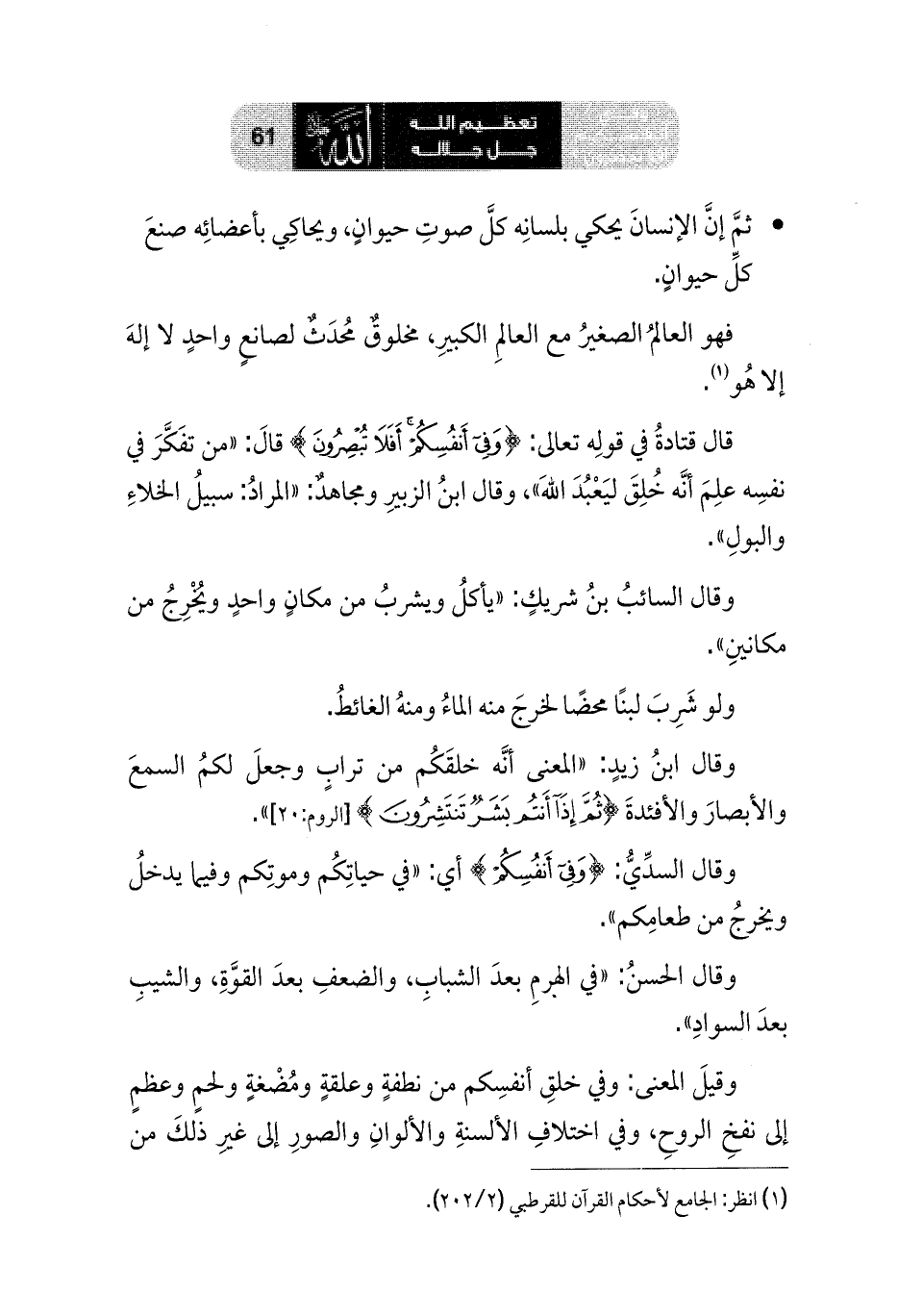 قال قتادةُ في قولِه تعالى: {وَفِي أَنْفُسِكُمْ أَفَلا تُبْصِرُونَ} قالَ: «من تفَكَّرَ في نفسِه علِمَ أنَّه خُلِقَ ليَعْبُدَ اللهَ»، وقال ابنُ الزبيرِ ومجاهدٌ: «المرادُ: سبيلُ الخلاءِ والبولِ».
