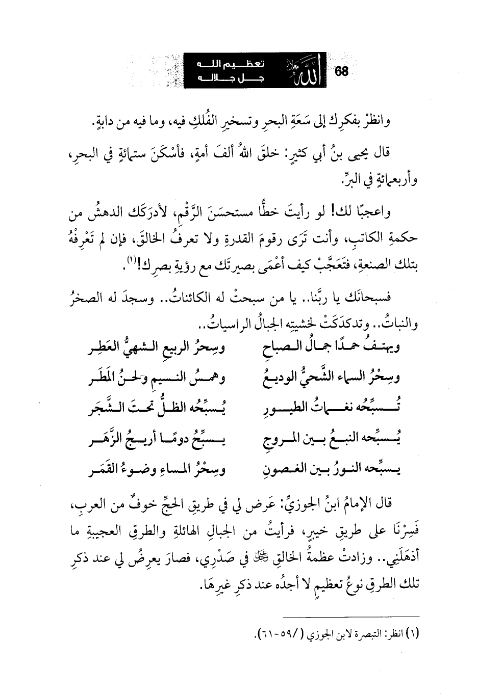 قال الإمامُ ابنُ الجوزيِّ: عَرض لي في طريقِ الحجِّ خوفٌ من العربِ، فَسِرْنَا على طريقِ خيبرٍ، فرأيتُ من الجبالِ الهائلةِ والطرقِ العجيبةِ ما أذهَلَنِي .. وزادتْ عظمةُ الخالقِ عز وجل في صَدْرِي، فصارَ يعرِضُ لي عند ذكرِ تلك الطرقِ نوعُ تعظيمٍ لا أجدُه عند ذكرِ غيرِهَا.