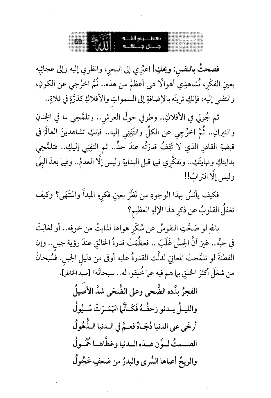 ثم جُولي في الأفلاكِ .. وطوفي حولَ العرشِ .. وتلمَّحِي ما في الجنانِ والنيرانِ .. ثم اخرُجِي عن الكلِّ والتَفِتِي إليه .. فإنكِ تشاهدينَ العالَمَ في قبضةِ القادرِ الذي لا تَقِفُ قدرَتُه عندَ حدٍّ .. ثم التفِتِي إليكِ .. فتلمَّحِي بدايتكِ ونهايتَكِ .. وتفكَّرِي فيما قبل البدايةِ وليس إلا العدمُ .. وفيما بعدَ البِلَى وليس إلا الترابُ!!