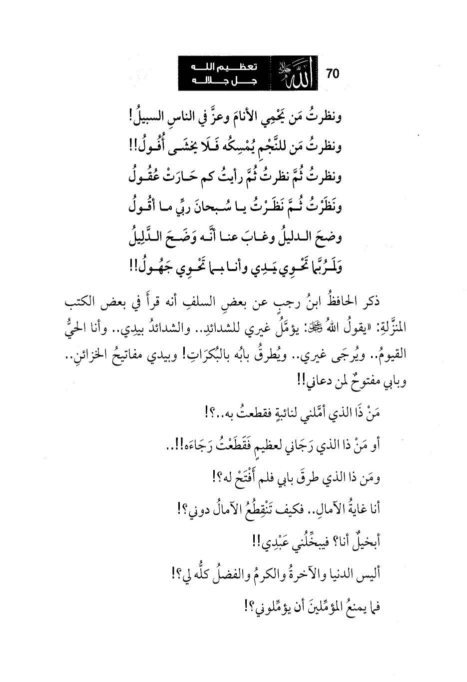 ذكر الحافظُ ابنُ رجبٍ عن بعضِ السلفِ أنه قرأَ في بعض الكتب المنزلةِ: «يقولُ اللهُ عز وجل: يؤمَّلُ غيري للشدائدِ .. والشدائدُ بيدِي .. وأنا الحيُّ القيومُ .. ويُرجَى غيري .. ويُطرقُ بابُه بالبُكرَاتِ! وبيدي مفاتيحُ الخزائنِ .. وبابي مفتوحٌ لمن دعاني!!