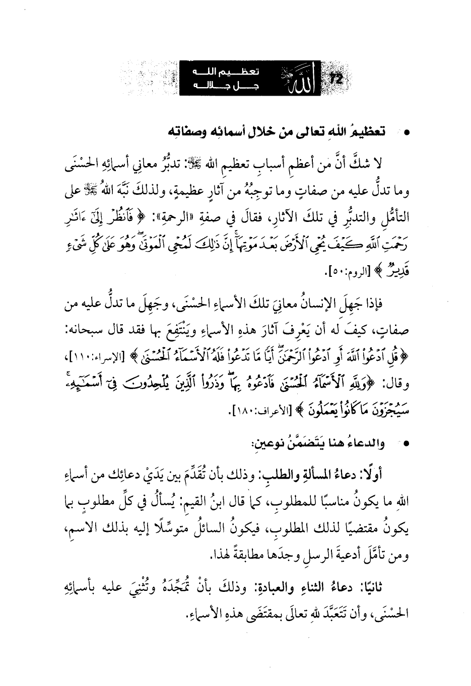 ثانيًا: دعاءُ الثناءِ والعبادةِ: وذلكَ بأنْ تُمَجِّدَهُ وتُثْنِيَ عليه بأسمائِهِ الحسْنَى وأن تَتَعَبَّدَ للهِ تعالَى بمقتَضَى هذهِ الأسماءِ.