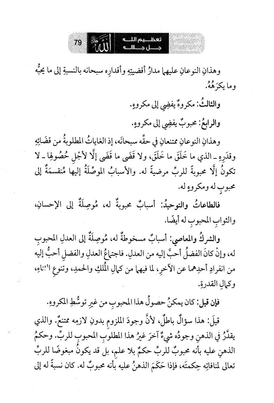 وهذانِ النوعانِ ممتنعانِ في حقِّه سبحانَه، إذ الغاياتُ المطلوبةُ من قضَائِهِ وقدَرِهِ ـ الذي ما خَلَقَ ما خَلَقَ، ولا قَضَى ما قَضَى إلَّا لأجْلِ حُصُولِها ـ لا تكونُ إلا محبوبةً للربِّ مرضيةً له. والأسبابُ الموصِّلَةُ إليها مُنقسمَةٌ إلى محبوبٍ له ومكروهٍ له.