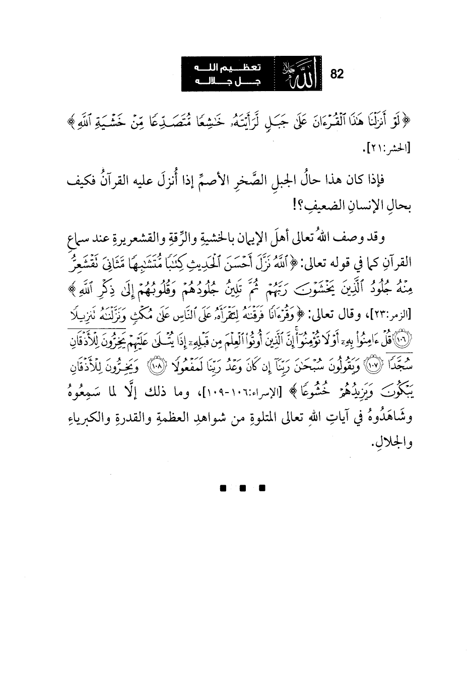 وقد وصف اللهُ تعالى أهلَ الإيمان بالخشيةِ والرقةِ والقشعريرةِ عند سماعِ القرآنِ كما في قوله تعالى: {اللَّهُ نَزَّلَ أَحْسَنَ الْحَدِيثِ كِتَابًا مُتَشَابِهًا مَثَانِيَ تَقْشَعِرُّ مِنْهُ جُلُودُ الَّذِينَ يَخْشَوْنَ رَبَّهُمْ ثُمَّ تَلِينُ جُلُودُهُمْ وَقُلُوبُهُمْ إِلَى ذِكْرِ اللَّهِ} [الزمر:23]، وقال تعالى: {وَقُرْآنًا فَرَقْنَاهُ لِتَقْرَأَهُ عَلَى النَّاسِ عَلَى مُكْثٍ وَنَزَّلْنَاهُ تَنْزِيلًا * قُلْ آمِنُوا بِهِ أَوْ لَا تُؤْمِنُوا إِنَّ الَّذِينَ أُوتُوا الْعِلْمَ مِنْ قَبْلِهِ إِذَا يُتْلَى عَلَيْهِمْ يَخِرُّونَ لِلْأَذْقَانِ سُجَّدًا * وَيَقُولُونَ سُبْحَانَ رَبِّنَا إِنْ كَانَ وَعْدُ رَبِّنَا لَمَفْعُولًا * وَيَخِرُّونَ لِلْأَذْقَانِ يَبْكُونَ وَيَزِيدُهُمْ خُشُوعًا} [الإسراء:106 - 109]، وما ذلك إلا لما سَمِعُوهُ وشَاهَدُوهُ في آياتِ اللهِ تعالى المتلوةِ من شواهدِ العظمةِ والقدرةِ والكبرياءِ والجلالِ.