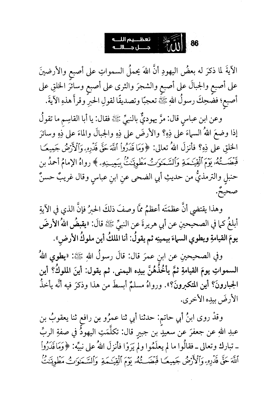 وعن ابن عباسٍ قال: مرَّ يهوديٌّ بالنبيِّ - صلى الله عليه وسلم - فقال: يا أبا القاسِمِ ما تقولُ إذا وضعَ اللهُ السماءَ على ذِهِ؟ والأرضَ على ذِهِ والجبالَ والماءَ على ذِهِ وسائرَ الخلقِ على ذِهِ؟ فأنزلَ اللهُ تعالى: {وَمَا قَدَرُوا اللَّهَ حَقَّ قَدْرِهِ وَالْأَرْضُ جَمِيعًا قَبْضَتُهُ يَوْمَ الْقِيَامَةِ وَالسَّماوَاتُ مَطْوِيَّاتٌ بِيَمِينِهِ} رواهُ الإمامُ أحمدُ بن حنبلٍ والترمذيُّ من حديثِ أبي الضحى عنِ ابنِ عباسٍ وقال غريبٌ حسنٌ صحيحٌ.
