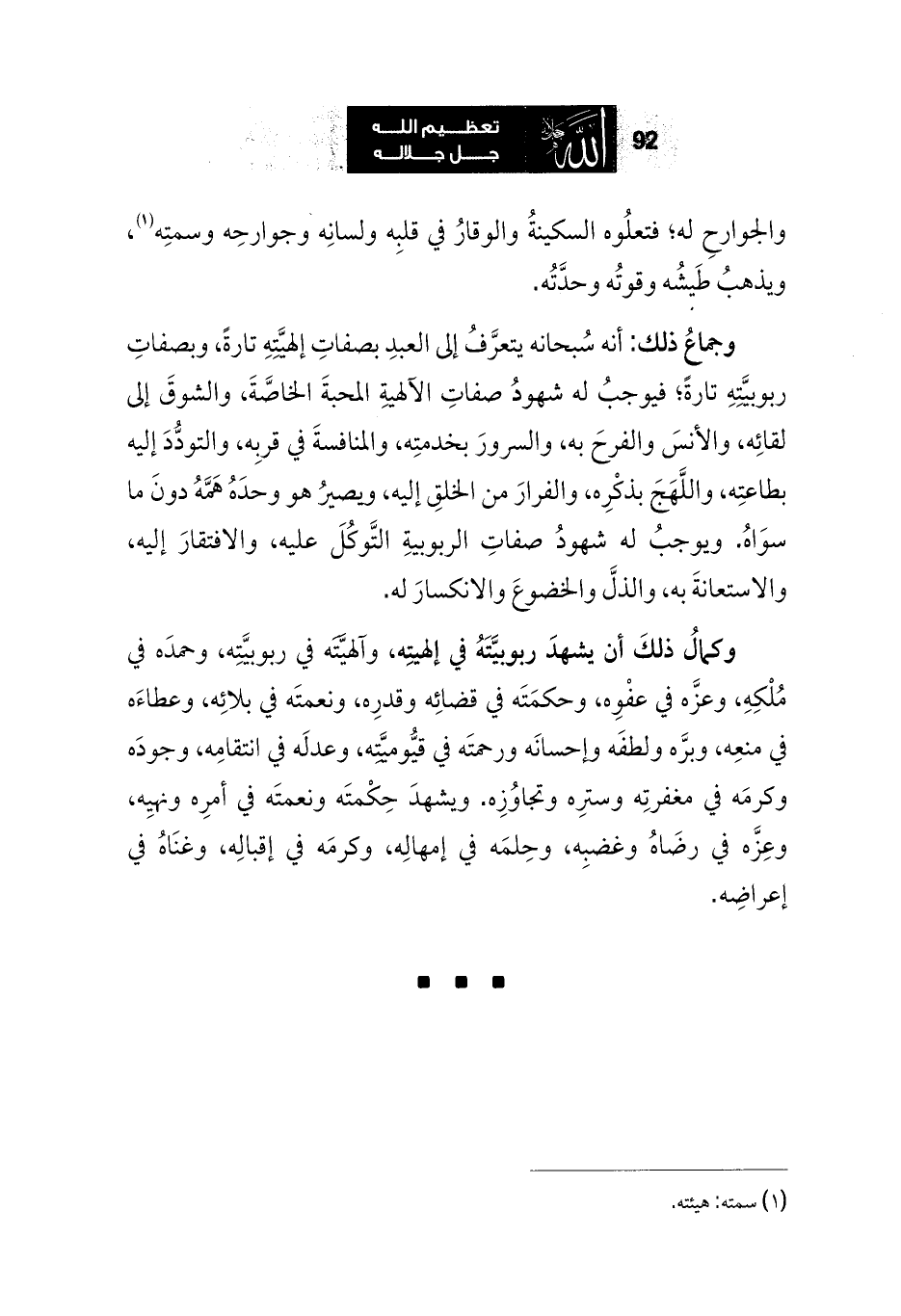 وجماعُ ذلك: أنه سبحانه يتعرفُ إلى العبدِ بصفاتِ إلهيَّتِهِ تارةً، وبصفاتِ ربوبيَّتِهِ تارةً؛ فيوجبُ له شهودُ صفاتِ الآلهيةِ المحبةَ الخاصَّةَ، والشوقَ إلى لقائِه، والأنسَ والفرحَ به، والسرورَ بخدمتِه، والمنافسةَ في قربِه، والتودُّدَ إليه بطاعتِه، واللَّهَجَ بذكْرِه، والفرارَ من الخلقِ إليه، ويصيرُ هو وحدَهُ هَمَّهُ دونَ ما سوَاهُ. ويوجبُ له شهودُ صفاتِ الربوبيةِ التوكلَ عليه، والافتقارَ إليه، والاستعانةَ به، والذلَّ والخضوعَ والانكسارَ له.