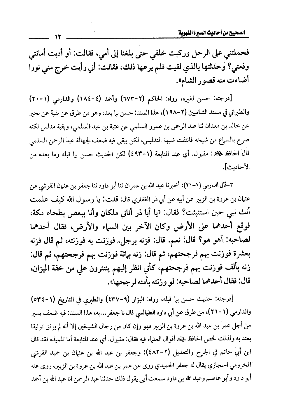 3 - قال الدارمي (1 - 21): أخبرنا عبد الله بن عمران ثنا أبو داود ثنا جعفر بن عثمان القرشي عن عثمان بن عروة بن الزبير عن أبيه عن أبي ذر الغفاري قال: قلت: يا رسول الله كيف علمت أنك نبي حين استنبئت؟ فقال: "يا أبا ذر أتاني ملكان وأنا ببعض بطحاء مكة، فوقع أحدهما على الأرض وكان الآخر بين السماء والأرض، فقال أحدهما لصاحبه: أهو هو؟ قال: نعم. قال: فزنه برجل، فوزنت به فوزنته، ثم قال فزنه بعشرة فوزنت بهم فرجحتهم، ثم قال: زنه بمائة فوزنت بهم فرجحتهم، ثم قال: زنه بألف فوزنت بهم فرجحتهم، كأني انظر إليهم ينتثرون علي من خفة الميزان، قال: فقال أحدهما لصاحبه: لو وزنته بأمته لرجحها".