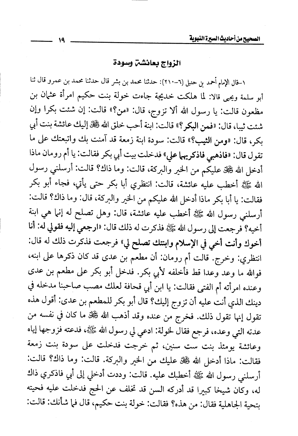 1 - قال الإمام أحمد بن حنبل (6 - 210): حدثنا محمَّد بن بشر قال حدثنا محمَّد بن عمرو قال ثنا أبو سلمة ويحيى قالا: لما هلكت خديجة جاءت خولة بنت حكيم امرأة عثمان بن مظعون قالت: يا رسول الله ألا تزوج، قال: "من؟ " قالت: إن شئت بكرًا وإن شئت ثيبًا، قال: "فمن البكر؟ " قالت: ابنة أحب خلق الله -عَزَّ وجَلَّ- إليك عائشة بنت أبي بكر، قال: "ومن الثيب؟ " قالت: سودة ابنة زمعة قد آمنت بك واتبعتك على ما تقول قال: "فاذهبي فاذكريهما علي" فدخلت بيت أبي بكر فقالت: يا أم رومان ماذا أدخل الله -عَزَّ وجَلَّ- عليكم من الخير والبركة، قالت: وما ذاك؟ قالت: أرسلني رسول الله - صلى الله عليه وسلم - أخطب عليه عائشة، قالت: انتظري أبا بكر حتى يأتي، فجاء أبو بكر فقالت: يا أبا بكر ماذا أدخل الله عليكم من الخير والبركة، قال: وما ذاك؟ قالت: أرسلني رسول الله - صلى الله عليه وسلم - أخطب عليه عائشة قال: وهل تصلح له إنما هي ابنة أخيه؟ فرجعت إلى رسول الله - صلى الله عليه وسلم - فذكرت له ذلك قال:"ارجعي إليه فقولي له: أنا أخوك وأنت أخي في الإسلام وابنتك تصلح لي" فرجعت فذكرت ذلك له قال: انتظري: وخرج. قالت أم رومان: أن مطعم بن عدى قد كان ذكرها على ابنه، فوالله ما وعد وعدًا قط فأخلفه لأبي بكر. فدخل أبو بكر على مطعم بن عدى وعنده امرأته أم الفتى فقالت: يا ابن أبي قحافة لعلك مصب صاحبنا مدخله في دينك الذي أنت عليه أن تزوج إليك؟ قال أبو بكر للمطعم بن عدى: أقول هذه تقول إنها تقول ذلك. فخرج من عنده وقد أذهب الله -عَزَّ وجَلَّ- ما كان في نفسه من عدته التي وعده، فرجع فقال لخولة: ادعي لي رسول الله - صلى الله عليه وسلم - فدعته فزوجها إياه وعائشة يومئذ بنت ست سنين، ثم خرجت فدخلت على سودة بنت زمعة فقالت: ماذا أدخل الله عليك من الخير والبركة. قالت: وما ذاك؟ قالت: أرسلني رسول الله - صلى الله عليه وسلم - أخطبك عليه. قالت: وددت أدخلي إلى أبي فاذكري ذاك له، وكان شيخًا كبيرًا قد أدركه السنن قد تخلف عن الحج فدخلت عليه فحيته بتحية الجاهلية فقال: من هذه؟ فقالت: خولة بنت حكيم، قال فما شأنك: قالت:
