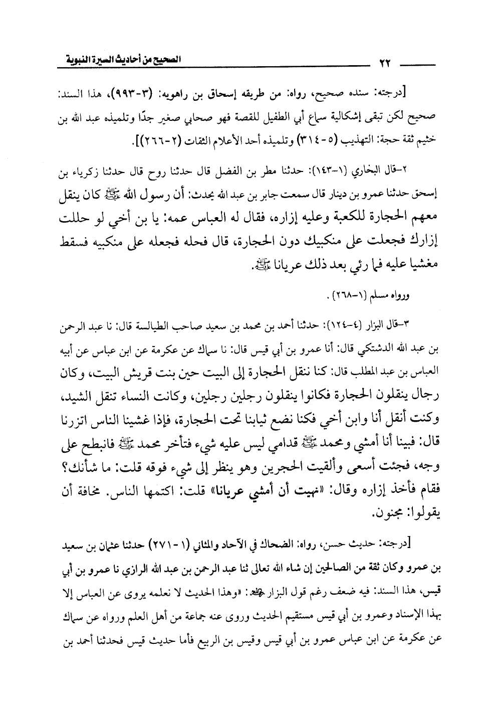 2 - قال البخاري (1 - 143): حدثنا مطر بن الفضل قال حدثنا روح قال حدثنا زكريا بن إسحاق حدثنا عمرو بن دينار قال سمعت جابر بن عبد الله يحدث: أن رسول الله - صلى الله عليه وسلم - كان ينقل معهم الحجارة للكعبة وعليه إزاره، فقال له العباس عمه: يا بن أخي لو حللت إزارك فجعلت على منكبيك دون الحجارة، قال فحله فجعله على منكبيه فسقط مغشيًا عليه فما رئي بعد ذلك عريانًا - صلى الله عليه وسلم -.