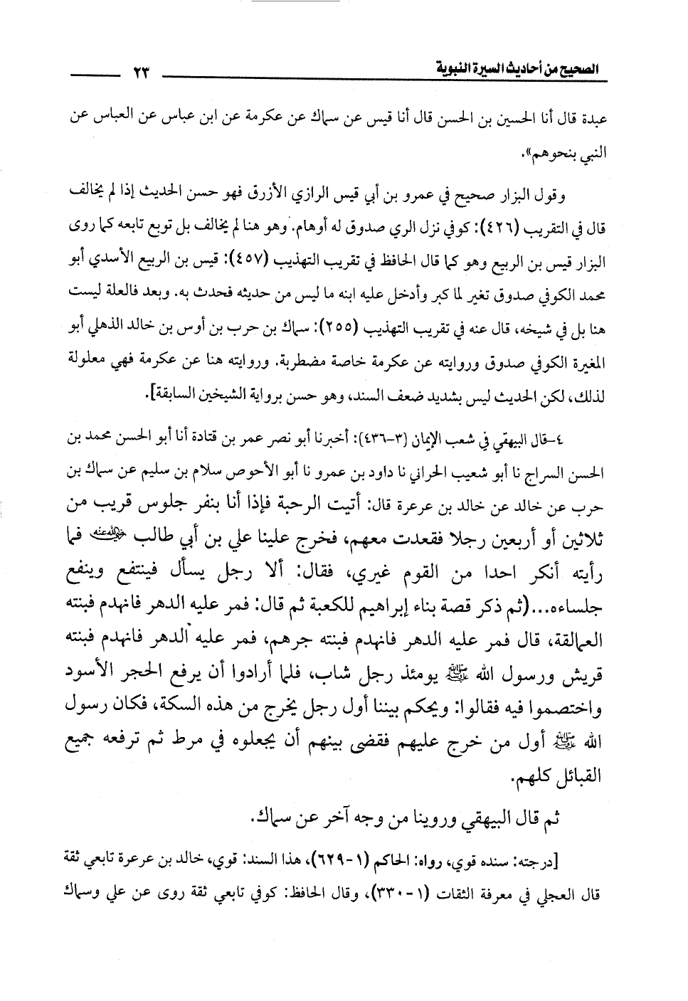 4 - قال البيهقي في شعب الإيمان (3 - 436): أخبرنا أبو نصر عمر بن قتادة أنا أبو الحسن محمَّد بن الحسن السراج نا أبو شعيب الحراني نا داود بن عمرو نا أبو الأحوص سلام بن سليم عن سماك بن حرب عن خالد عن خالد بن عرعرة قال: أتيت الرحبة فإذا أنا بنفر جلوس قريب من ثلاثين أو أربعين رجلًا فقعدت معهم، فخرج علينا علي بن أبي طالب - رضي الله عنه - فما رأيته أنكر أحدًا من القوم غيري، فقال: ألا رجل يسأل فينتفع وينفع جلساءه ... (ثم ذكر قصة بناء إبراهيم للكعبة ثم قال: فمر عليه الدهر فانهدم فبنته العمالقة، قال فمر عليه الدهر فانهدم فبنته جرهم، فمر عليه الدهر فانهدم فبنته قريش ورسول الله - صلى الله عليه وسلم - يومئذ رجل شاب فلما أرادوا أن يرفع الحجر الأسود واختصموا فيه فقالوا: ويحكم بيننا أول رجل يخرج من هذه السكة، فكان رسول الله - صلى الله عليه وسلم - أول من خرج عليهم فقضى بينهم أن يجعلوه في مرط ثم ترفعه جميع القبائل كلهم.
