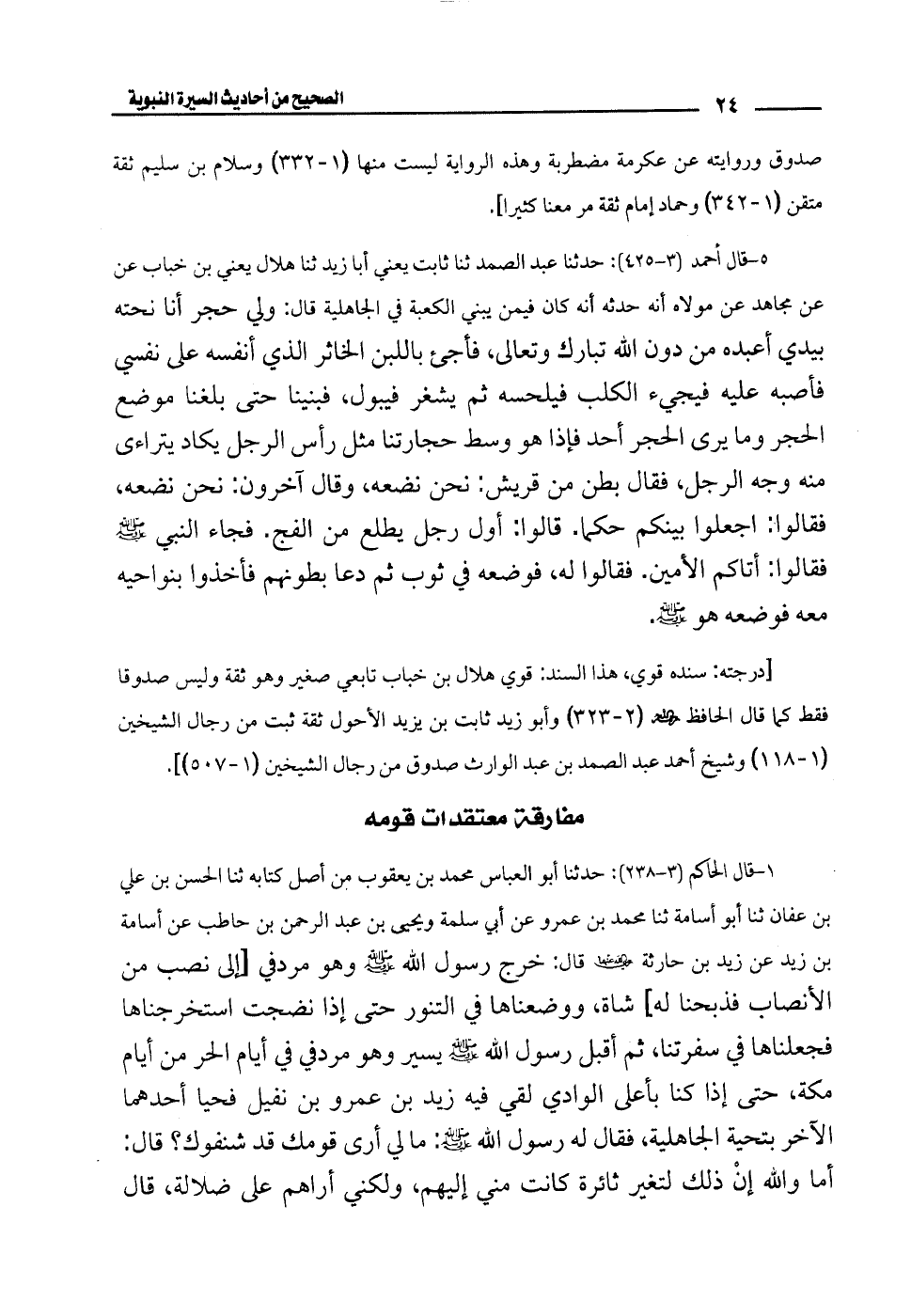 1 - قال الحاكم (3 - 238): حدثنا أبو العباس محمَّد بن يعقوب من أصل كتابه ثنا الحسن بن علي بن عفان ثنا أبو أسامة ثنا محمَّد بن عمرو عن أبي سلمة ويحيى بن عبد الرحمن بن حاطب عن أسامة بن زيد عن زيد بن حارثة - رضي الله عنه - قال: خرج رسول الله - صلى الله عليه وسلم - وهو مردفي [إلى نصب من الأنصاب فذبحنا له] شاة، ووضعناها في التنور حتى إذا نضجت استخرجناها فجعلناها في سفرتنا، ثم أقبل رسول الله - صلى الله عليه وسلم - يسير وهو مردفي في أيام الحر من أيام مكة، حتى إذا كنا بأعلى الوادي لقي فيه زيد بن عمرو بن نفيل فحيا أحدهما الآخر بتحية الجاهلية، فقال له رسول الله - صلى الله عليه وسلم -: ما لي أرى قومك قد شنفوك؟ قال: أما والله إن ذلك لتغير ثائرة كانت مني إليهم، ولكني أراهم على ضلالة، قال
