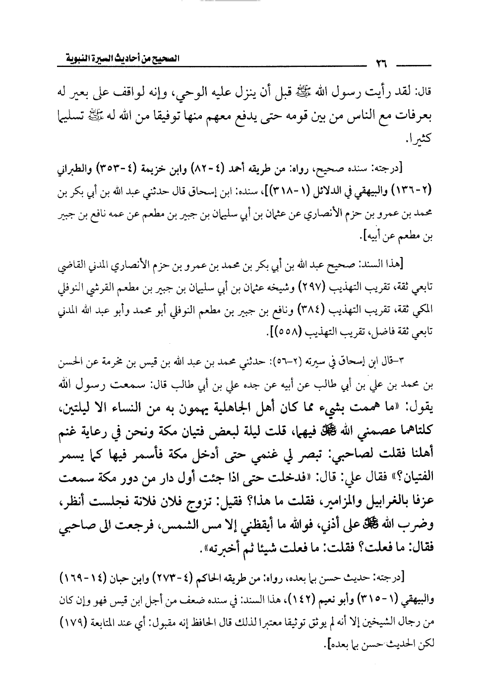 3 - قال ابن إسحاق في سيرته (2 - 56): حدثني محمَّد بن عبد الله بن قيس بن مخرمة عن الحسن بن محمَّد بن علي بن أبي طالب عن أبيه عن جده علي بن أبي طالب قال: سمعت رسول الله يقول: "ما هممت بشيء مما كان أهل الجاهلية يهمون به من النساء إلا ليلتين، كلتاهما عصمني الله -عَزَّ وجَلَّ- فيهما، قلت ليلة لبعض فتيان مكة ونحن في رعاية غنم أهلنا فقلت لصاحبي: تبصر لي غنمي حتى أدخل مكة فأسمر فيها كما يسمر الفتيان؟ " فقال علي: قال: "فدخلت حتى إذا جئت أول دار من دور مكة سمعت عزفًا بالغرابيل والمزامير، فقلت ما هذا؟ فقيل: تزوج فلان فلانة فجلست أنظر، وضرب الله -عَزَّ وجَلَّ- على أذني، فوالله ما أيقظني إلا مس الشمس، فرجعت إلى صاحبي فقال: ما فعلت؟ فقلت: ما فعلت شيئًا ثم أخبرته".