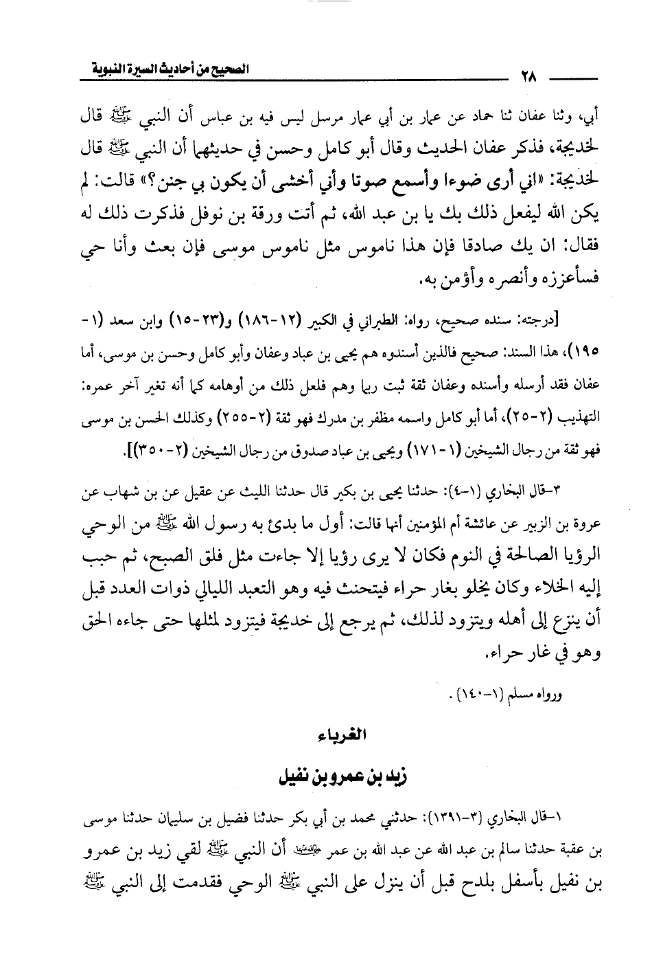 1 - قال البخاري (3 - 1391): حدثني محمَّد بن أبي بكر حدثنا فضيل بن سليمان حدثنا موسى بن عقبة حدثنا سالم بن عبد الله عن عبد الله بن عمر - رضي الله عنه - أن النبي - صلى الله عليه وسلم - لقي زيد بن عمرو بن نفيل بأسفل بلدح قبل أن ينزل على النبي - صلى الله عليه وسلم - الوحي فقدمت إلى النبي - صلى الله عليه وسلم -