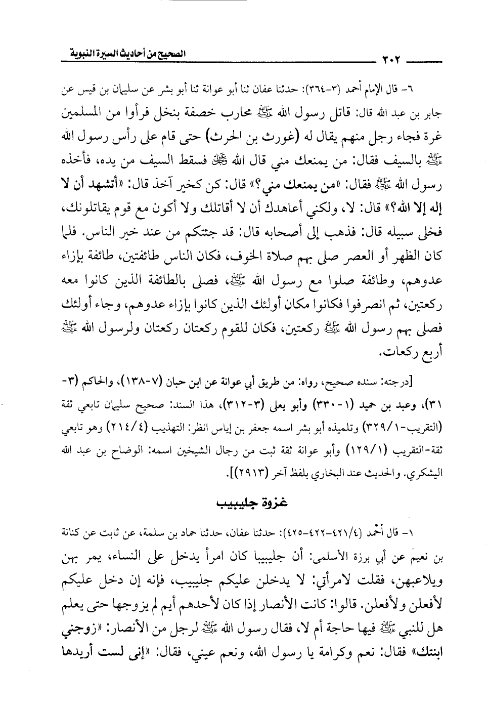 6 - قال الإِمام أحمد (3 - 364): حدثنا عفان ثنا أبو عوانة ثنا أبو بشر عن سليمان بن قيس عن جابر بن عبد الله قال: قاتل رسول الله - صلى الله عليه وسلم - محارب خصفة بنخل فرأوا من المسلمين غرة فجاء رجل منهم يقال له (غورث بن الحرث) حتى قام على رأس رسول الله - صلى الله عليه وسلم - بالسيف فقال: من يمنعك مني قال الله -عَزَّ وجَلَّ- فسقط السيف من يده، فأخذه رسول الله - صلى الله عليه وسلم - فقال: "من يمنعك مني؟ " قال: كن كخير آخذ قال: "أتشهد أن لا إله إلا الله؟ " قال: لا , ولكني أعاهدك أن لا أقاتلك ولا أكون مع قوم يقاتلونك، فخلى سبيله قال: فذهب إلى أصحابه قال: قد جئتكم من عند خير الناس، فلما كان الظهر أو العصر صلى بهم صلاة الخوف، فكان الناس طائفتين، طائفة بإزاء عدوهم، وطائفة صلوا مع رسول الله - صلى الله عليه وسلم -، فصلى بالطائفة الذين كانوا معه ركعتين، ثم انصرفوا فكانوا مكان أولئك الذين كانوا بإزاء عدوهم، وجاء أولئك فصلى بهم رسول الله - صلى الله عليه وسلم - ركعتين، فكان للقوم ركعتان ركعتان ولرسول الله - صلى الله عليه وسلم - أربع ركعات.