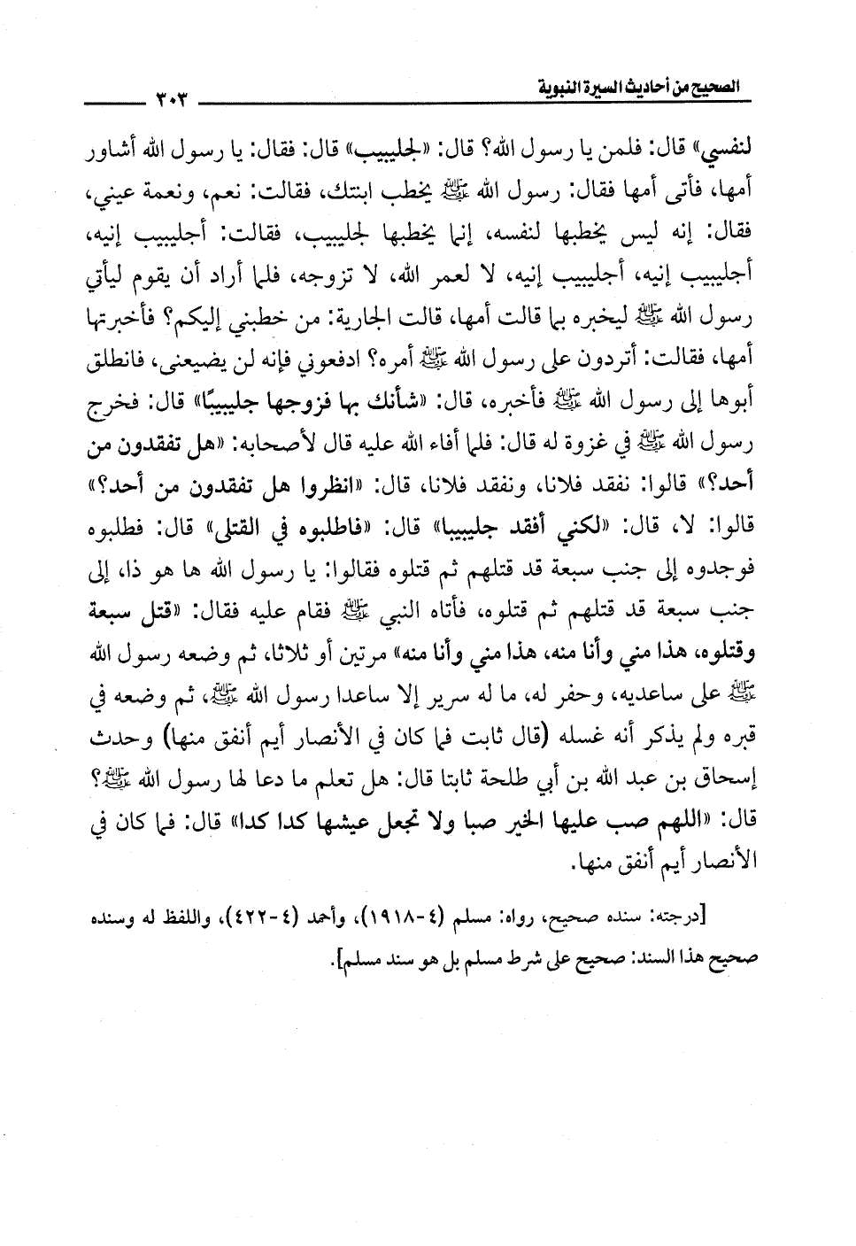 لنفسي" قال: فلمن يا رسول الله؟ قال: "لجليبيب" قال فقال يا رسول الله أشاور أمها، فأتى أمها فقال: رسول الله - صلى الله عليه وسلم - يخطب ابنتك، فقالت: نعم، ونعمة عيني، فقال: إنه ليس يخطبها لنفسه، إنما يخطبها لجليبيب، فقالت: أجليبيب إنيه، أجليبيب إنيه، أجليبيب إنيه، لا لعمر الله، لا تزوجه، فلما أراد أن يقوم ليأتي رسول الله - صلى الله عليه وسلم - ليخبره بما قالت أمها، قالت الجارية: من خطبني إليكم؟ فأخبرتها أمها، فقالت: أتردون على رسول - صلى الله عليه وسلم - أمره؟ ادفعوني فإنه لن يضيعنى، فانطلق أبوها إلى رسول الله - صلى الله عليه وسلم - فأخبره، قال: "شأنك بها فزوجها جليبيبًا" قال: فخرج رسول الله - صلى الله عليه وسلم - في غزوة له قال: فلما أفاء الله عليه قال لأصحابه: "هل تفقدون من أحد؟ " قالوا: نفقد فلانا، ونفقد فلانا، قال"انظروا هل تفقدون من أحد؟ " قالوا: لا، قال: "لكني أفقد جليبيبا" قال: "فاطلبوه في القتلى" قال: فطلبوه فوجدوه إلى جنب سبعة قد قتلهم ثم قتلوه فقالوا: يا رسول الله ها هو ذا، إلى جنب سبعة قد قتلهم ثم قتلوه فأتاه النبي - صلى الله عليه وسلم - فقام عليه فقال: "قتل سبعة وقتلوه، هذا مني وأنا منه، هذا مني وأنا منه" مرتين أو ثلاثًا، ثم وضعه رسول الله - صلى الله عليه وسلم - على ساعديه، وحفر له، ما له سرير إلا ساعدا رسول الله - صلى الله عليه وسلم -، ثم وضعه في قبره ولم يذكر أنه غسله (قال ثابت فما كان في الأنصار أيم أنفق منها) وحدث إسحاق بن عبد الله بن أبي طلحة ثابتا قال: هل تعلم ما دعا لها رسول الله - صلى الله عليه وسلم -؟ قال: "اللَّهم صب عليها الخير صبًا ولا تجعل عيشها كدا كدا" قال: فما كان في الأنصار أيم أنفق منها.