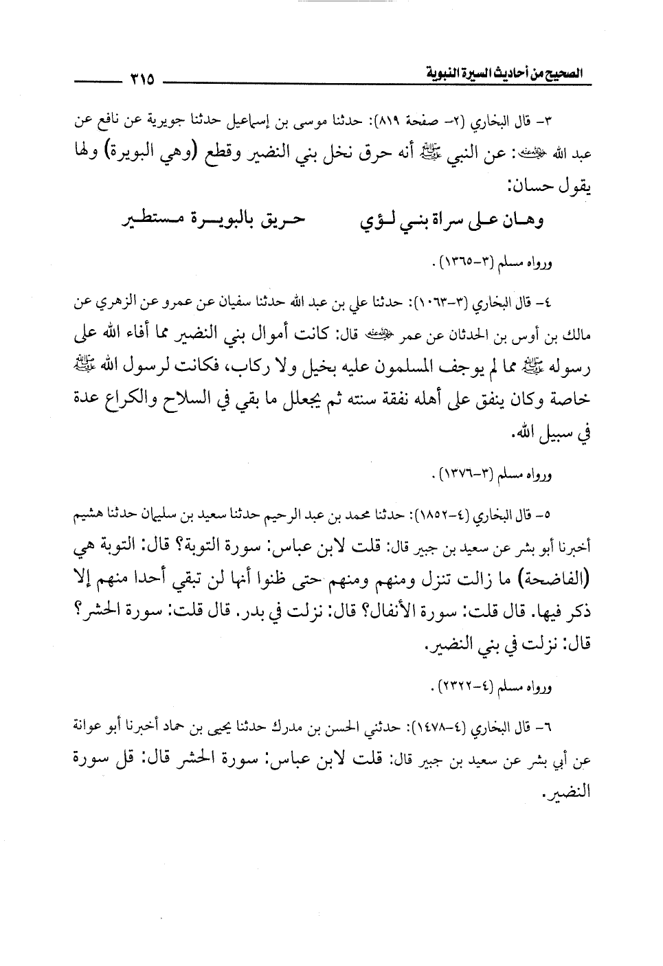 3 - قال البخاري (2 - صفحة 819): حدثنا موسى بن إسماعيل حدثنا جويرية عن نافع عن عبد الله -رضي الله عنه- عن النبي - صلى الله عليه وسلم - أنه حرق نخل بني النضير وقطع (وهي البويرة) ولها يقول حسان: