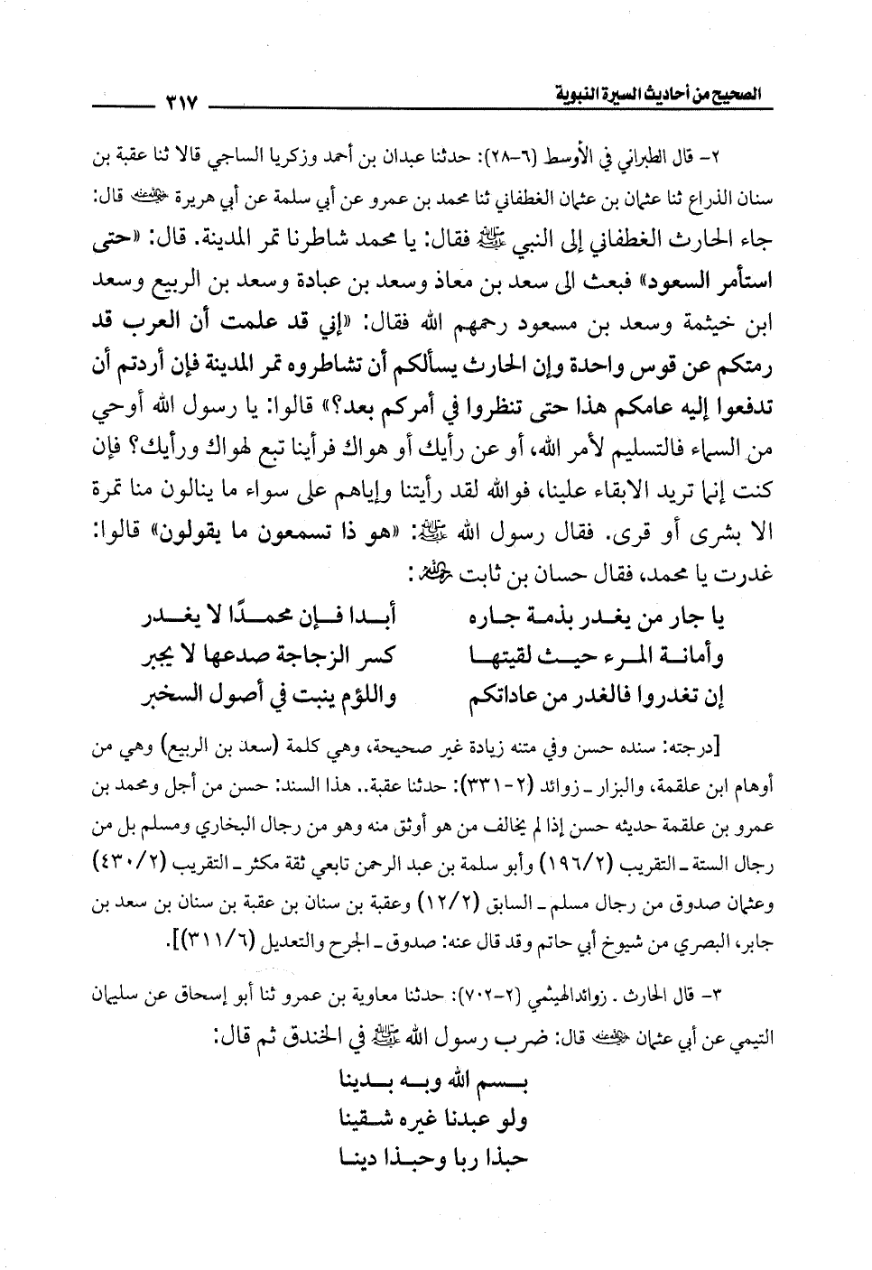3 - قال الحارث: زوائد الهيثمي (2 - 702): حدثنا معاوية بن عمرو ثنا أبو إسحاق عن سليمان التيمي عن أبي عثمان -رضي الله عنه- قال: ضرب رسول - صلى الله عليه وسلم - في الخندق ثم قال: