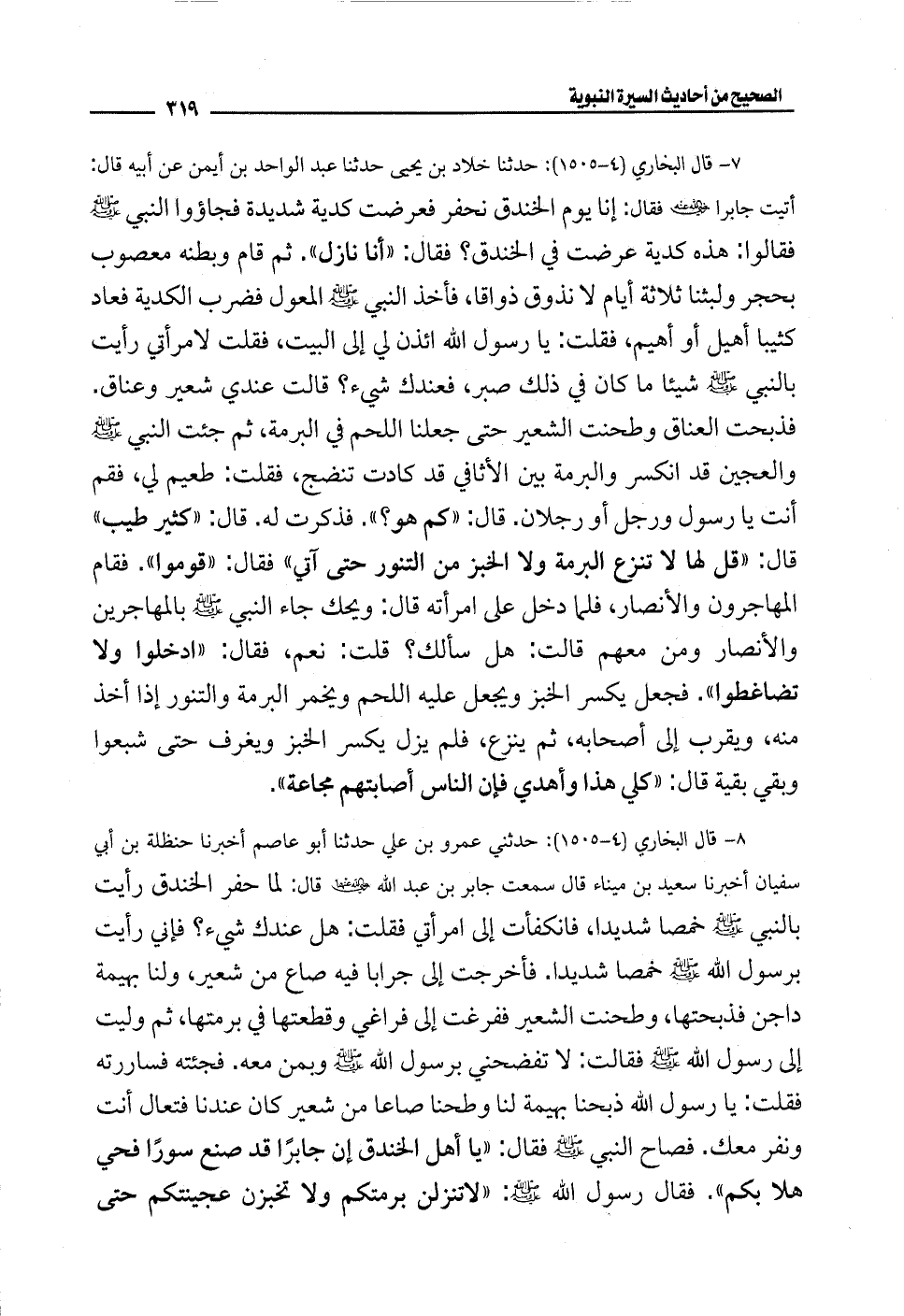 8 - قال البخاري (4 - 1505):حدثني عمرو بن علي حدثنا أبو عاصم أخبرنا حنظلة بن أبي سفيان أخبرنا سعيد بن ميناء قال سمعت جابر بن عبد الله -رضي الله عنهما- قال: لما حفر الخندق رأيت بالنبي - صلى الله عليه وسلم - خمصا شديدًا، فانكفأت إلى امرأتي فقلت: هل عندك شيء؟ فإني رأيت برسول الله - صلى الله عليه وسلم - خمصا شديدا. فأخرجت إلي جرابًا فيه صاع من شعير، ولنا بهيمة داجن فذبحتها، وطحنت الشعير ففرغت إلى فراغي وقطعتها في برمتها، ثم وليت إلى رسول الله - صلى الله عليه وسلم - فقالت: لا تفضحنى برسول الله - صلى الله عليه وسلم - وبمن معه. فجئته فساررته فقلت: يا رسول الله ذبحنا بهيمة لنا وطحنا صاعا من شعير كان عندنا فتعال أنت ونفر معك. فصاح النبي - صلى الله عليه وسلم - فقال: "يا أهل الخندق إن جابرًا قد صنع سورًا فحي هلا بكم"، فقال رسول الله - صلى الله عليه وسلم -: (لا تنزلن برمتكم ولا تخبزن عجينتكم حتى
