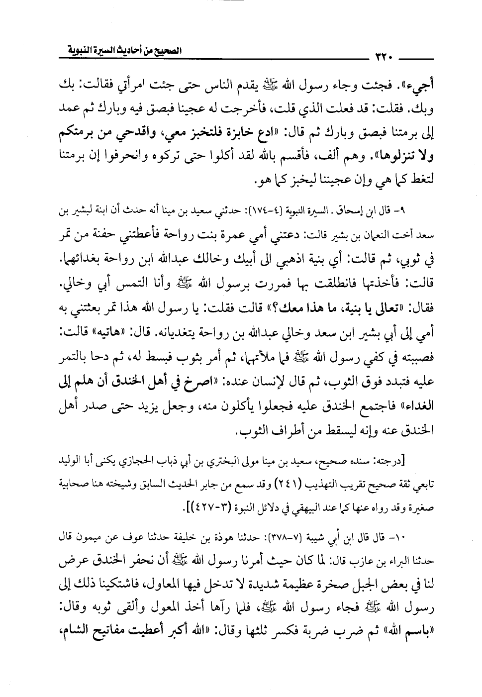 9 - قال ابن إسحاق. السيرة النبوية (4 - 174): حدثني سعيد بن مينا أنه حدث أن ابنة لبشير بن سعد أخت النعمان بن بشير قالت: دعتني أمي عمرة بنت رواحة فأعطتني حفنة من تمر في ثوبي، ثم قالت: أي بنية اذهبي إلى أبيك وخالك عبد الله ابن رواحة بغدائهما. قالت: فأخذتها فانطلقت بها فمررت برسول الله - صلى الله عليه وسلم - وأنا التمس أبي وخالي. فقال: "تعالى يا بنية, ما هذا معك؟ " قالت فقلت: يا رسول الله هذا تمر بعثتني به أمي إلى أبي بشير ابن سعد وخالي عبد الله بن رواحة يتغديانه. قال: "هاتيه" قالت: فصببته في كفي رسول الله - صلى الله عليه وسلم - فما ملأتهما، ثم أمر بثوب فبسط له، ثم دحا بالتمر عليه فتبدد فوق الثوب، ثم قال لإنسان عنده: "اصرخ في أهل الخندق أن هلم إلى الغداء" فاجتمع الخندق عليه فجعلوا يأكلون منه , وجعل يزيد حتى صدر أهل الخندق عنه وإنه ليسقط من أطراف الثوب.