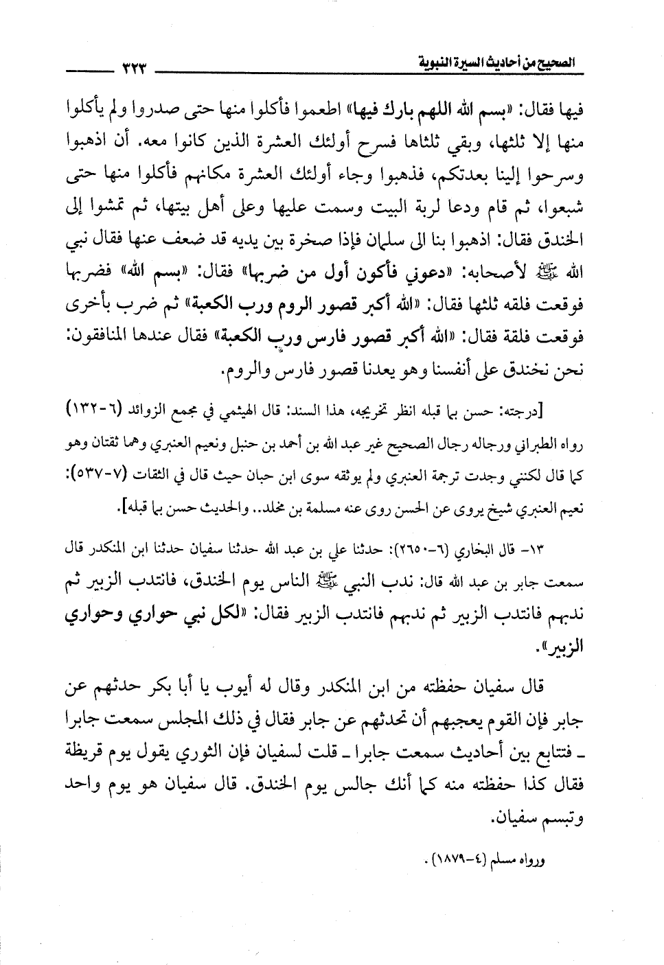 13 - قال البخاري (6 - 2650): حدثنا علي بن عبد الله حدثنا سفيان حدثنا ابن المنكدر قال سمعت جابر بن عبد الله قال: ندب النبي - صلى الله عليه وسلم - الناس يوم الخندق، فانتدب الزبير ثم ندبهم فانتدب الزبير ثم ندبهم فانتدب الزبير فقال. "لكل نبي حواري وحواري الزبير".