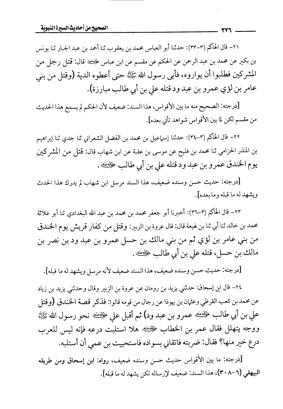 23 - قال الحاكم (3 - 36):أخبرنا أبو جعفر محمد بن محمد بن عبد الله البغدادي ثنا أبو علاثة محمد بن خالد ثنا أبي ثنا بن لهيعة قال: قال عروة بن الزبير: وقتل من كفار قريش يوم الخندق من بني عامر بن لؤي ثم من بني مالك بن حسل عمرو بن عبد ود بن نصر بن مالك بن حسل، قتله علي بن أبي طالب -رضي الله عنه-.