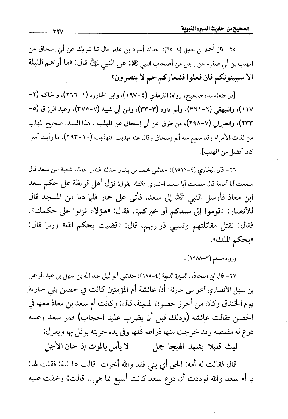 27 - قال ابن إسحاق. السيرة النبوية (4 - 185): حدثني أبو ليلى عبد الله بن سهل بن عبد الرحمن بن سهل الأنصاري أخو بني حارثة: أن عائشة أم المؤمنين كانت في حصن بني حارثة يوم الخندق وكان من أحرز حصون المدينة، قال: وكانت أم سعد بن معاذ معها في الحصن فقالت عائشة (وذلك قبل أن يضرب علينا الحجاب) فمر سعد وعليه درع له مقلصة وقد خرجت منها ذراعه كلها وفي يده حربته يرفل بها ويقول:
